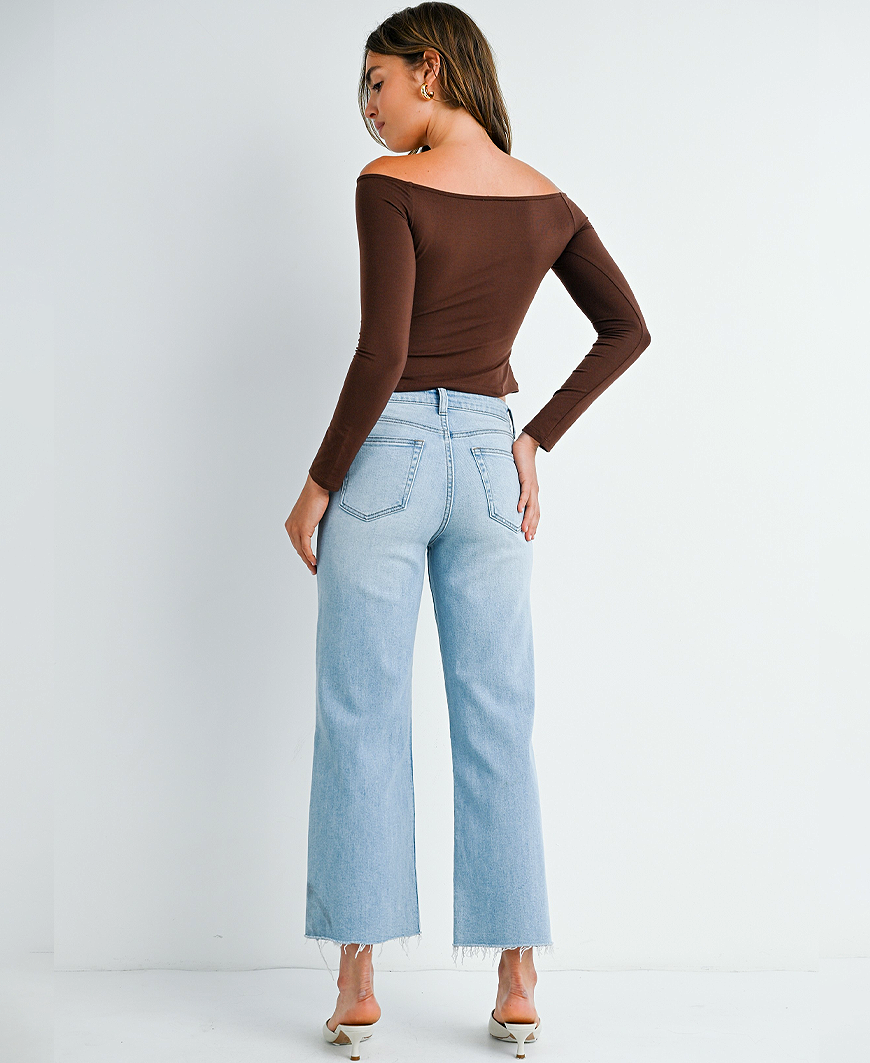 Upgrade your denim game with the Elyse Wide Leg Denim in a light wash. Featuring a high-rise 10.5″ rise that sits comfortably at your belly button and a flattering wide-leg silhouette with a 27″ inseam, these almost-cropped jeans are perfect for transitional wardrobes. The soft, stretchy fabric ensures comfort while maintaining shape, making them ideal for street-style looks or casual everyday outfits.