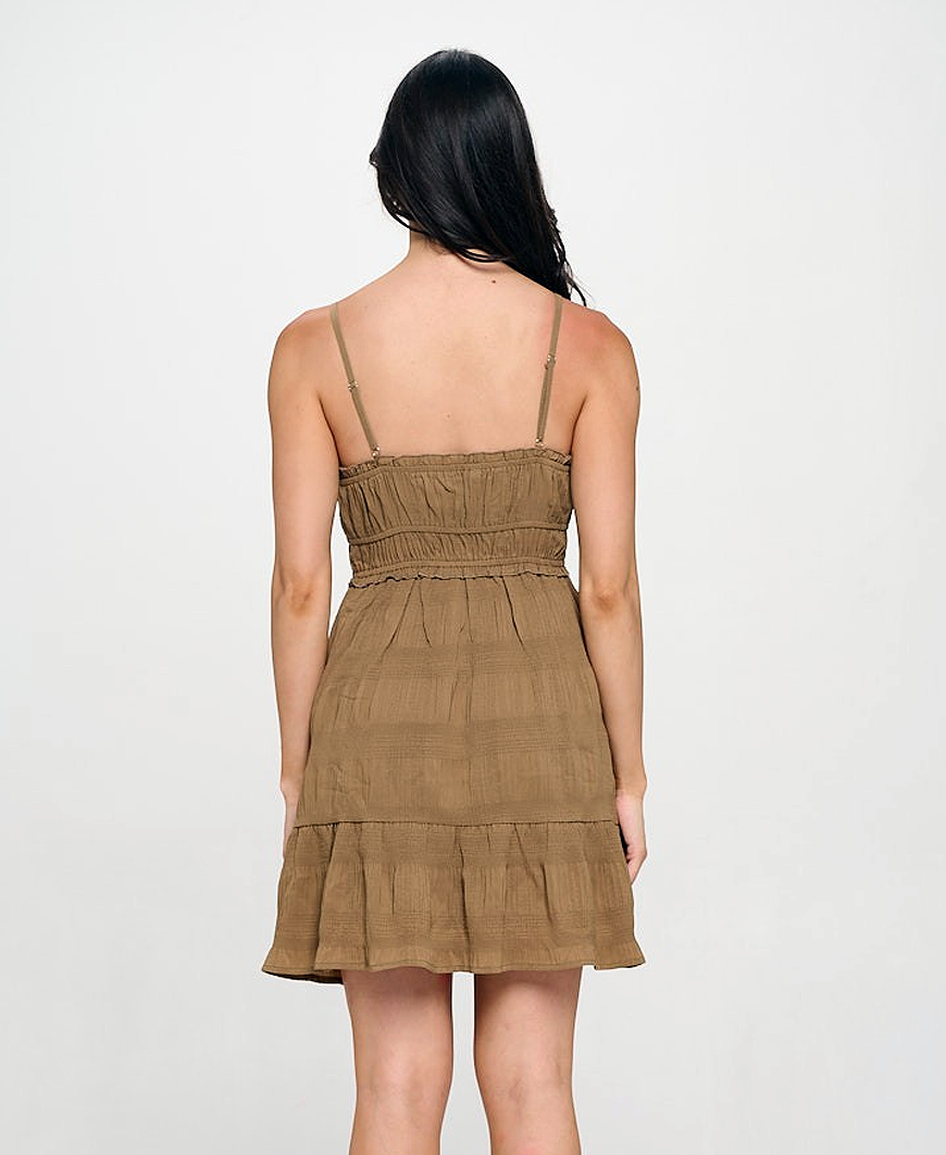Turn heads effortlessly in the Michaela Crinkle Mini Dress in a rich mocha hue. Crafted with soft crinkle smocked fabric, this dress features a flattering elastic waist, playful front tie, and delicate ruffle details. Its mini length makes it perfect for brunches, date nights, or casual weekend outings, while the lightweight polyester fabric keeps you comfortable all day.