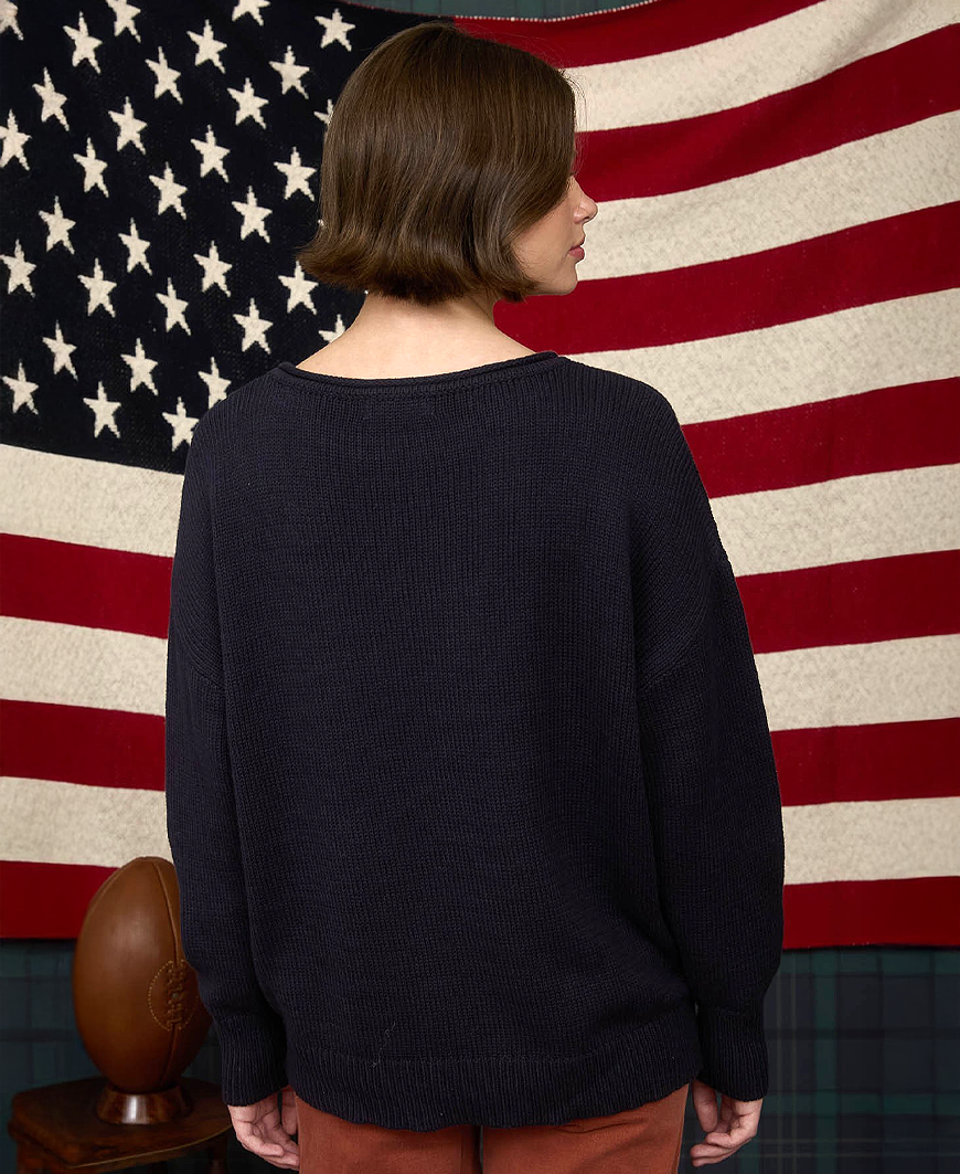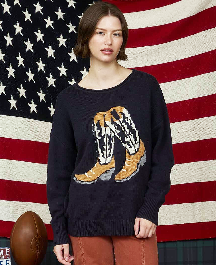 Add a touch of Western charm to your cozy days with the Western Boots Knit Sweater in navy. Featuring a fun boot jacquard pattern woven into a soft cotton-blend knit, this pullover combines playful style with everyday comfort. The relaxed, oversized fit and drop shoulder design create a laid-back silhouette that’s perfect for pairing with denim or leggings.