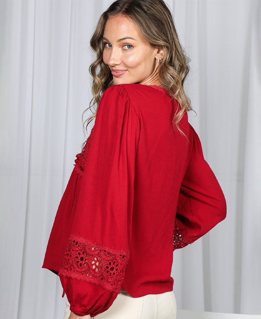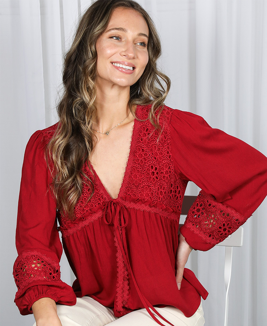 Regular price $69.00 Sale price $58.99Meredith Eyelet Lace Blouse – Burgundy
