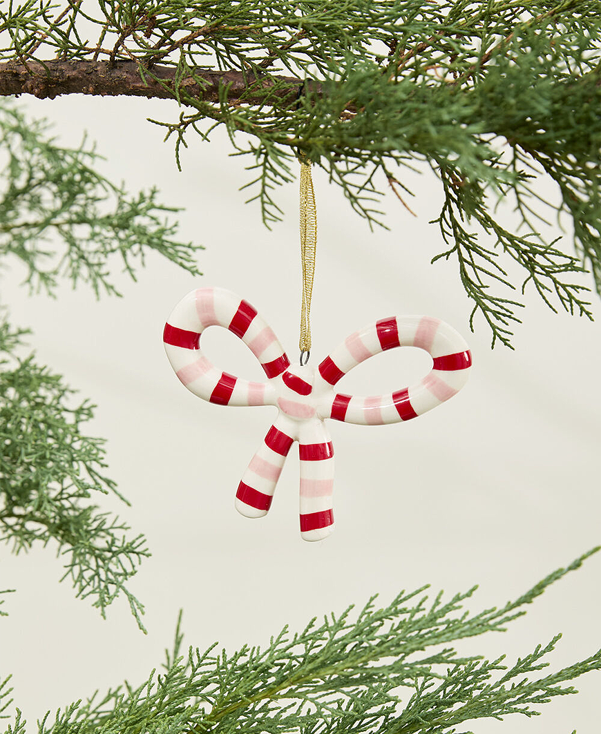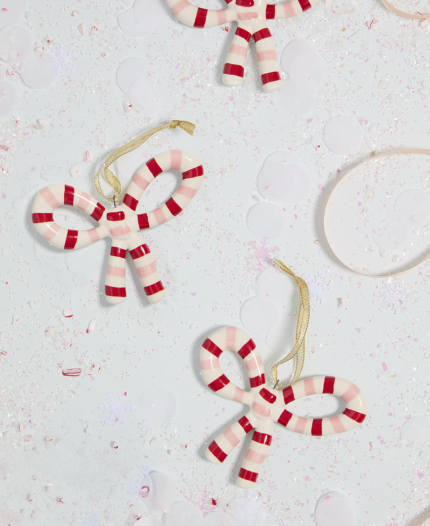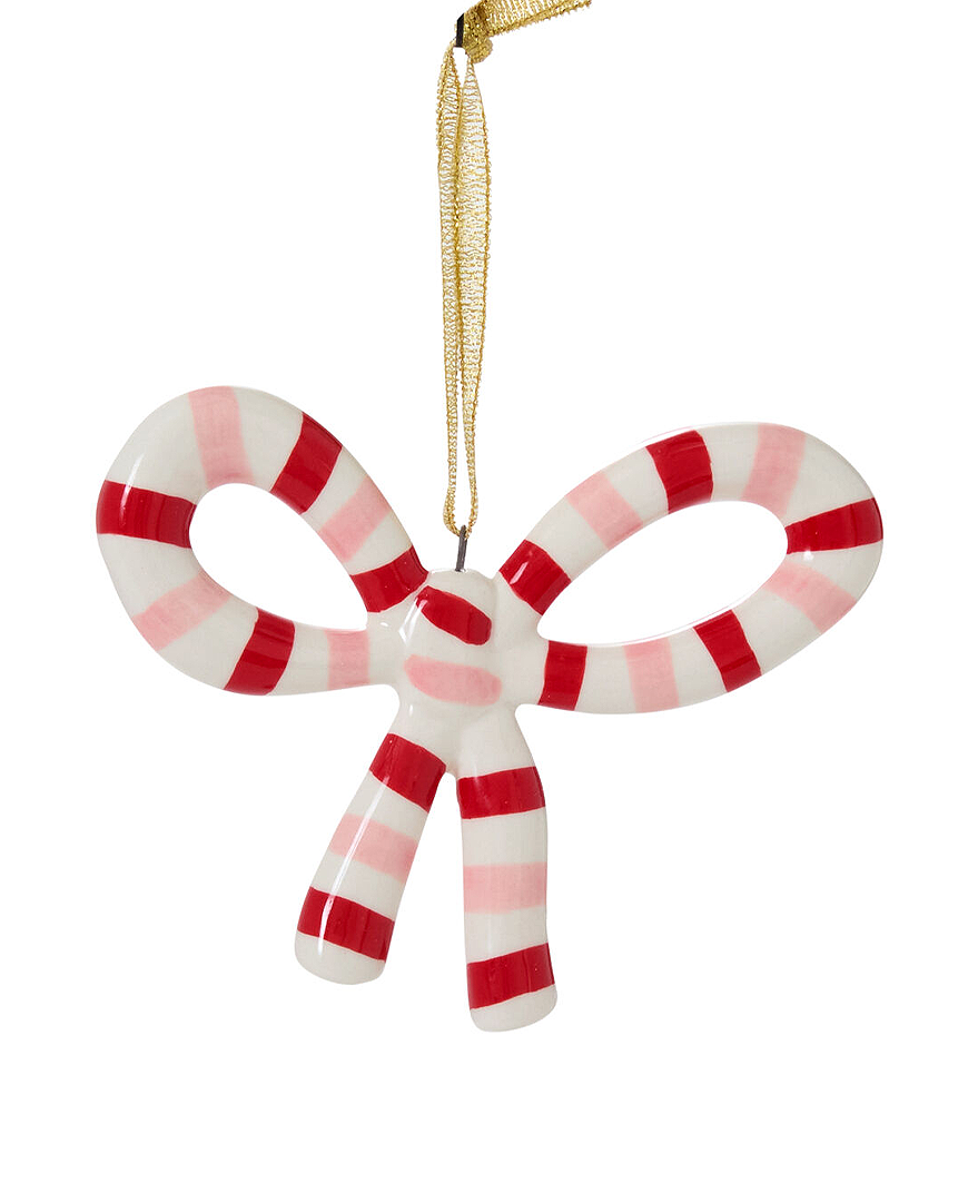 Add a festive finishing touch to your holiday décor with the Luella Bow Ornament. Crafted from ceramic to resemble a perfectly tied bow, this charming piece features hand-painted red and pink candy cane stripes on a warm off-white base. Lightweight yet durable, it’s perfect for hanging on your Christmas tree, accenting garlands, or topping wrapped presents for an extra-special detail. A versatile holiday accent that brings a touch of sweetness and cheer to any space.