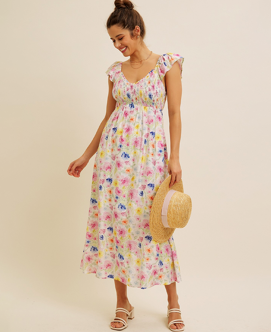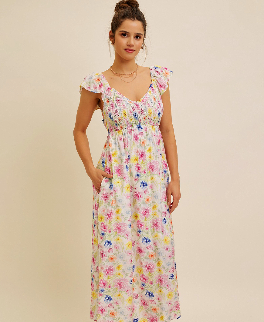 Bold, feminine, and made to stand out — the Celicia Pop Of Color Floral Smocked Maxi Dress is your ultimate statement piece for the season. Featuring a vibrant multi-color floral print set against a stunning fuchsia backdrop, this maxi dress brings effortless energy and elegance to any occasion.Designed with a flattering smocked bodice for a comfortable, flexible fit, this sleeveless silhouette is finished with soft ruffled straps and a charming back bow detail for an extra touch of romance. The flowing maxi length creates graceful movement, while side pockets add everyday functionality. Fully lined for comfort and coverage, this dress transitions beautifully from brunch dates to beach vacations, weddings, and summer soirées.