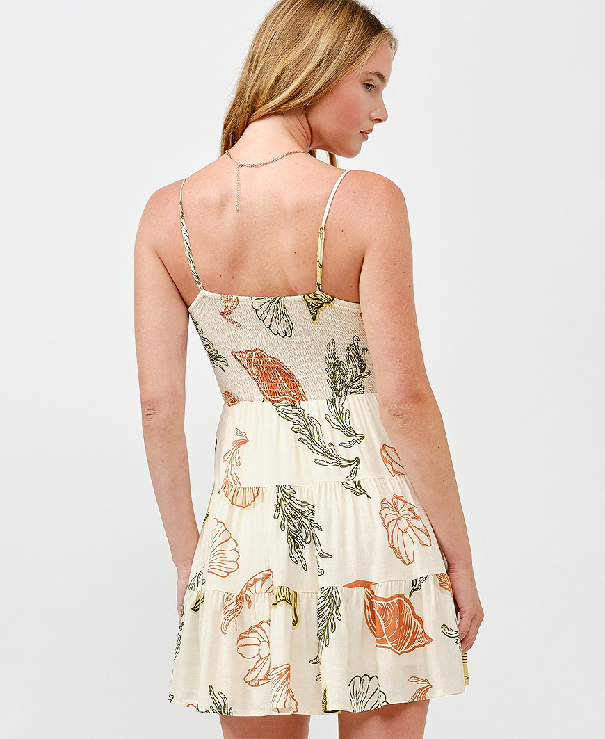The Dion Printed Cut Out Dress blends earthy tones with playful, feminine details. Featuring a flattering front cut-out with an adjustable drawstring tie, this sleeveless dress highlights the waist with a comfortable elastic waistband and smocked back for an easy, flexible fit. Soft ruffle accents add movement and charm, while the lightweight rayon fabric and full lining keep it effortlessly wearable from day to night.