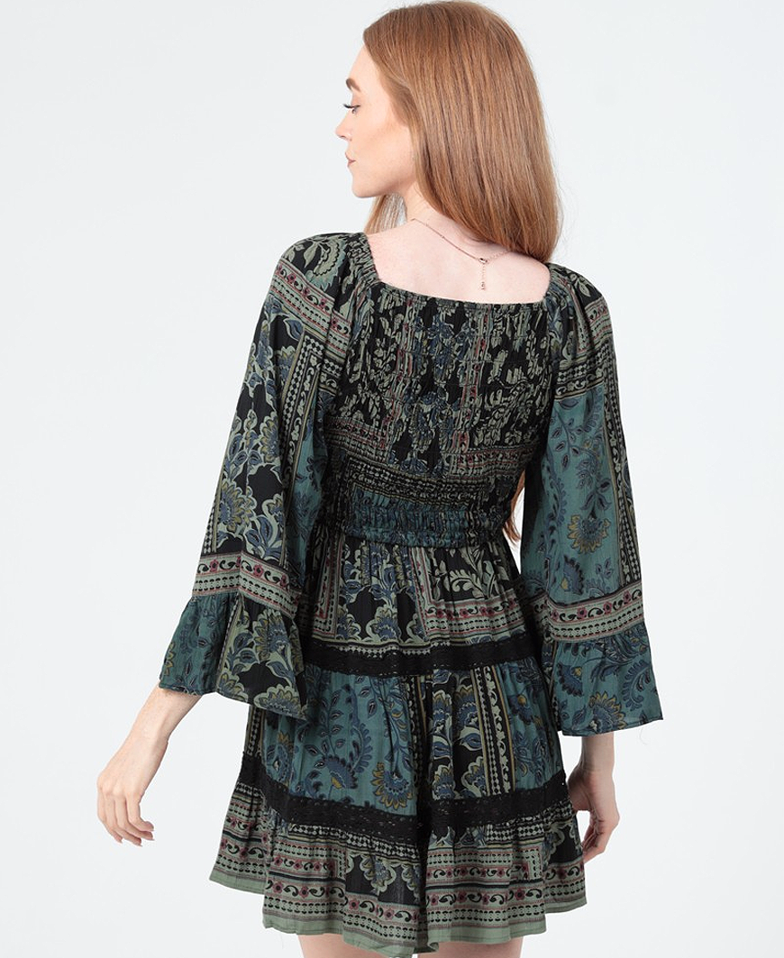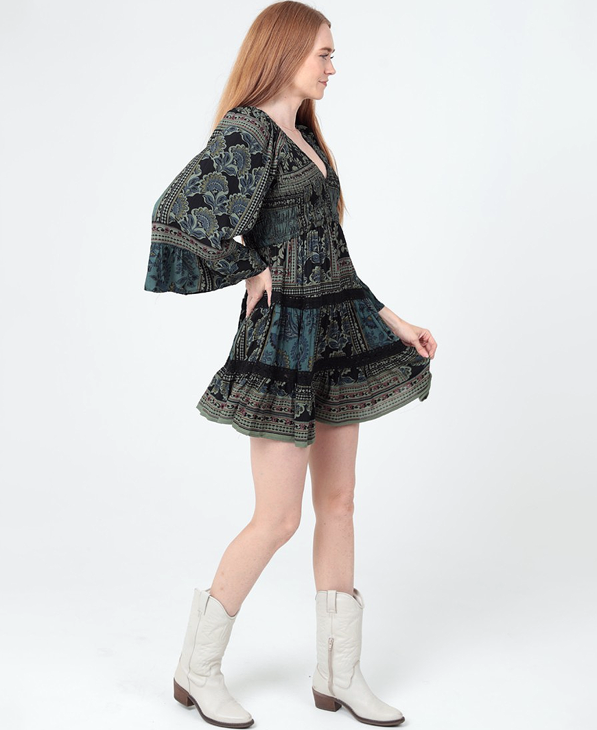 Kinley Boho Bell Sleeve Mini Dress -  Black/Olive