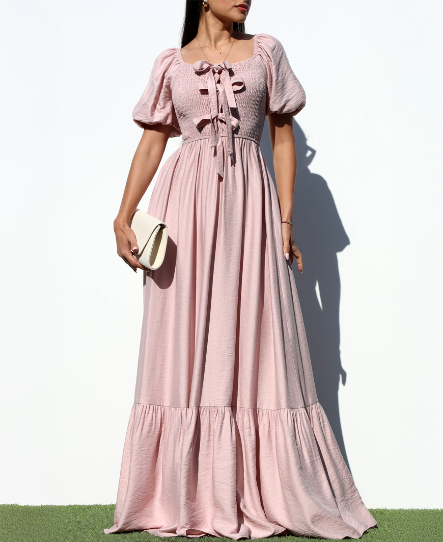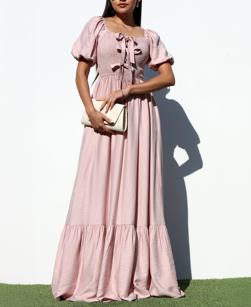 Soft, romantic, and effortlessly elegant — the Sparrow Smock Top Woven Maxi Dress in blush is made for your prettiest moments. Featuring a flattering smocked bodice with delicate ribbon tie detail at the neckline, this maxi dress blends comfort with feminine charm. The puff sleeves and flowing tiered skirt create a graceful silhouette, while the smocked top provides stretch and structure for an easy, comfortable fit. Crafted from a soft woven fabric that’s non–see-through, this dress drapes beautifully and moves with you — perfect for spring weddings, baby showers, brunch dates, or Easter celebrations.