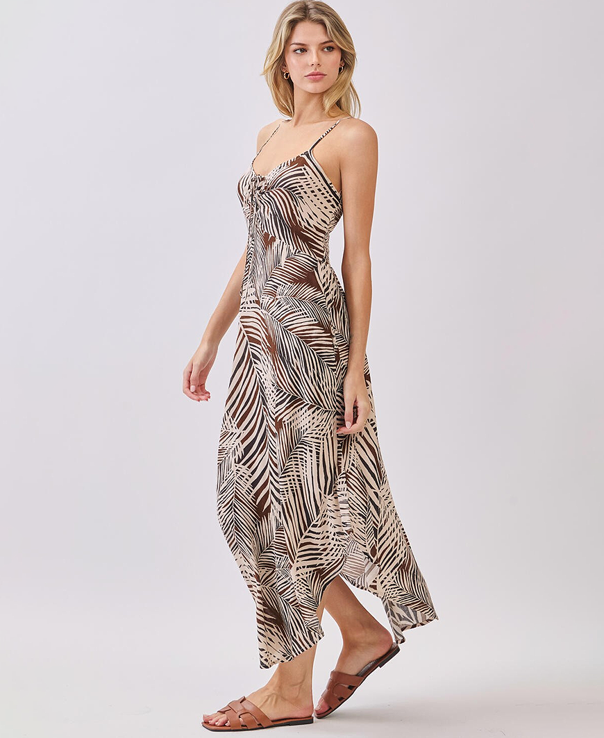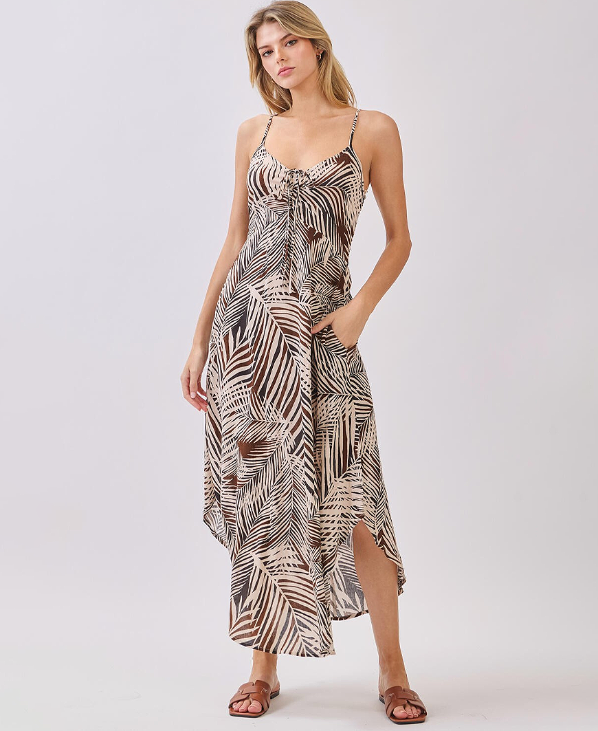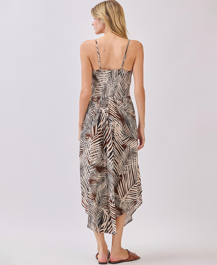Effortlessly feminine with a tropical twist, the Tamera Ruched Midi Dress features a flattering ruched bodice and a softly rounded hem for graceful movement. Designed in a rich black and mocha palm fronds print, this midi delivers an elevated yet relaxed silhouette that’s perfect for warm days and sunset evenings alike. Crafted from lightweight rayon, it drapes beautifully on the body while keeping you comfortable and chic. Style it with sandals for daytime or dress it up with wedges and statement jewelry for an easy resort-ready look.