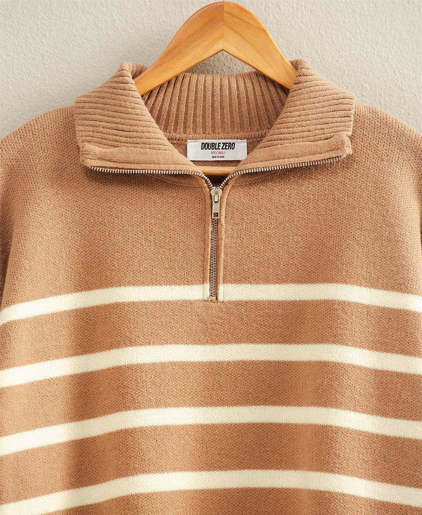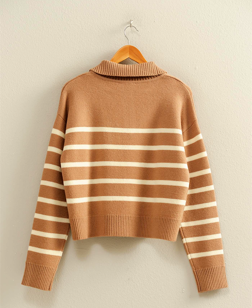 Add timeless charm to your everyday style with the Kathryn Stripe Half Zip Sweater from Daisy Shoppe. Designed with a classic taupe-and-cream stripe pattern and a high neckline with a half zip closure, this sweater combines modern polish with cozy comfort. The structured knit holds its shape beautifully while remaining soft and easy to wear. Perfect for layering over a tee or styling under your favorite coat, this versatile piece transitions seamlessly from casual days to elevated evenings.