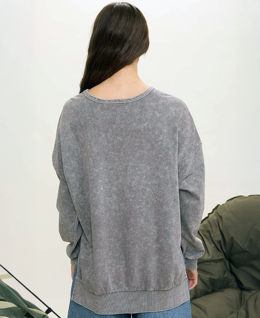 Upgrade your casual-chic wardrobe with the Kendra Side Split Long Sleeve from Daisy Shoppe. This relaxed-fit long sleeve top features a round neckline, drop shoulder design, and a trendy side hem split, giving you effortless movement and style. The acid-washed charcoal pattern adds a vintage-inspired vibe, perfect for layering over jeans, skirts, or leggings. Made with a soft cotton-polyester blend and subtle stretch in the contrast fabric, this top ensures comfort without compromising style.