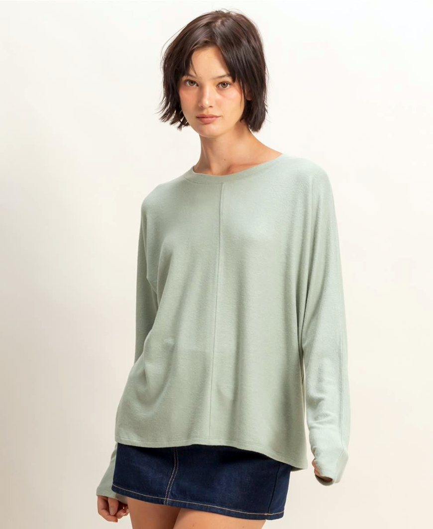 Stay effortlessly stylish and comfortable in the Kiana Center Seam Long Sleeve from Daisy Shoppe. Designed with a relaxed crew neckline and a center seam detail, this soft brushed top offers a flattering drape with no armhole seams for smooth movement and a modern silhouette. Its light sage hue adds timeless charm to your wardrobe, making it the perfect piece for layering under jackets or wearing solo. Pair it with jeans, trousers, or leggings for a polished yet cozy look.