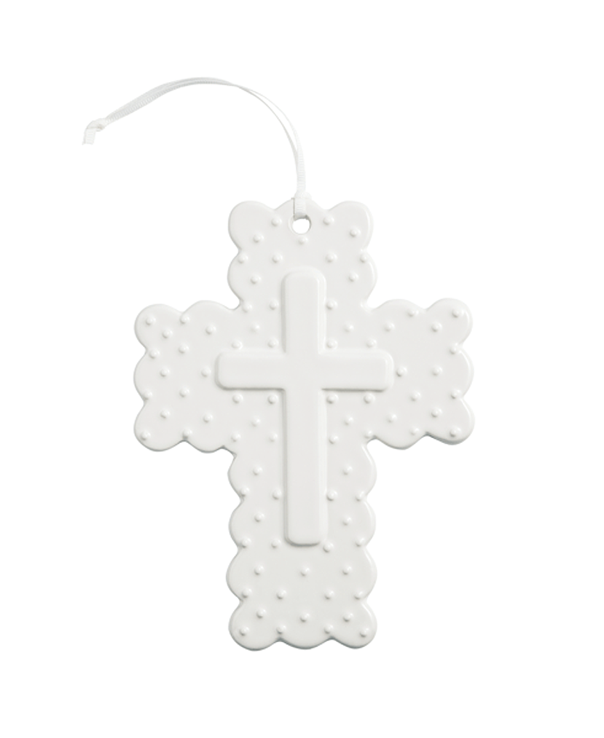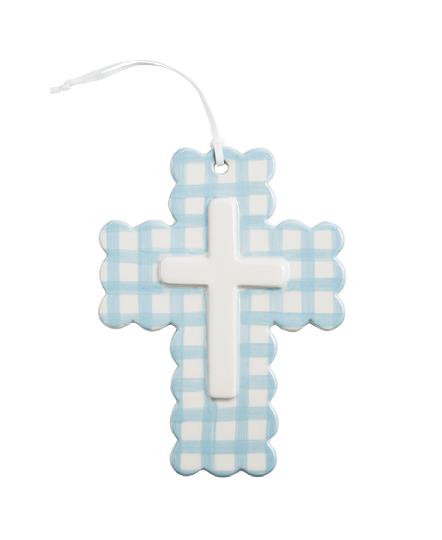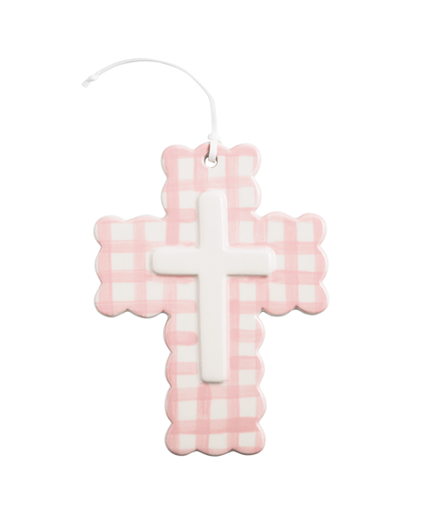 Add a meaningful and charming touch to your home with our Gingham Ceramic Crosses. Each cross is beautifully hand-painted with a classic gingham pattern and crafted from layered ceramic for added depth and texture. Soft scalloped edges give this piece a delicate, heirloom-inspired feel, while the attached ribbon hanger makes it easy to display on a wall, door, or gallery arrangement.