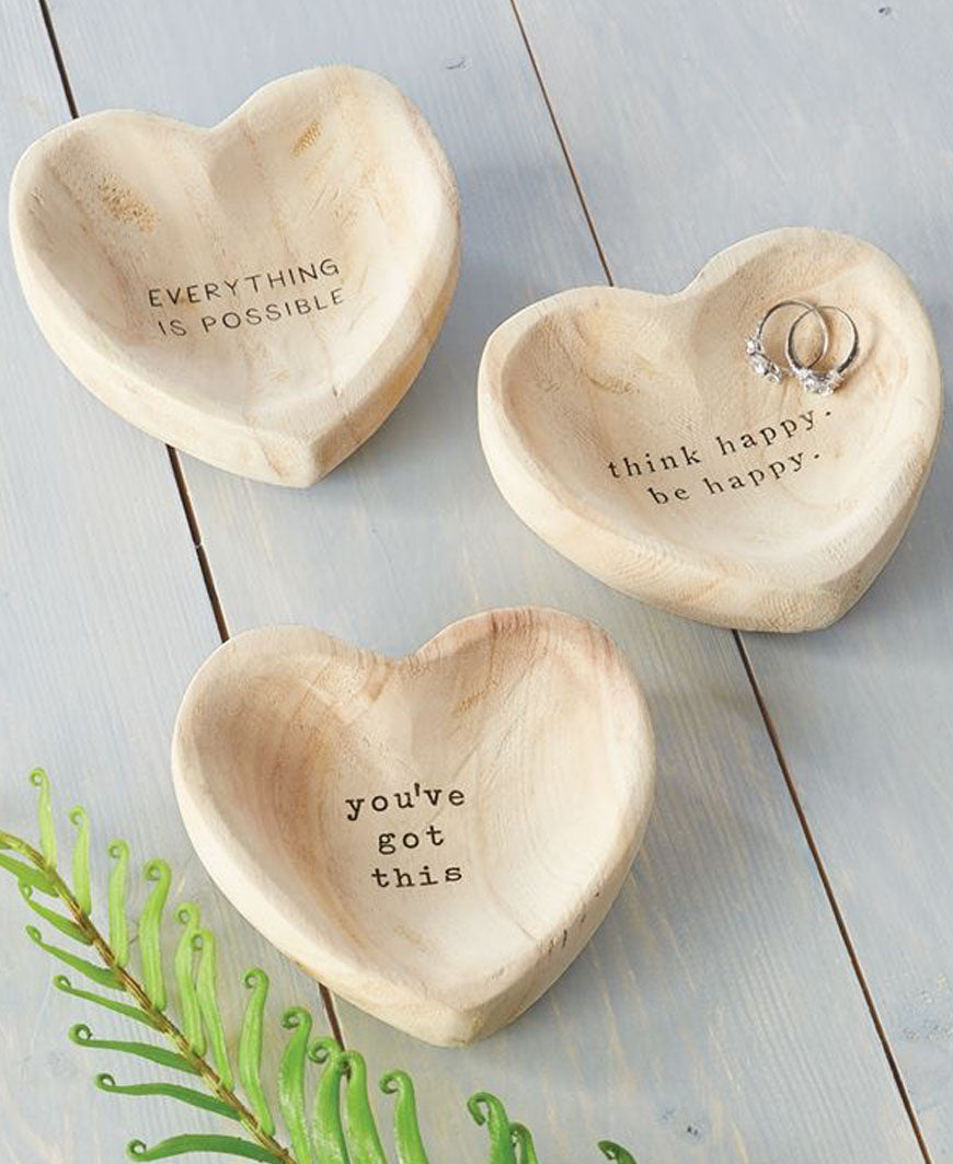 Keep your small treasures organized with a touch of inspiration with these Wooden Heart Trinket Trays. Crafted from smooth Paulownia wood, each heart-shaped tray features an etched sentiment on the surface, reminding you to “Think Happy,” “You’ve Got This,” or “Everything is Possible.” Perfect for rings, earrings, keys, or desk accessories, these trays add a charming and motivational accent to any space. The warm brown wood finish complements any décor, making them a thoughtful gift or a little daily boost for yourself.