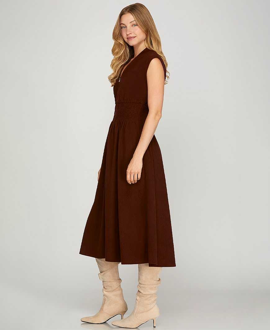 Meet your new fall favorite π The Leslie Midi Dress blends comfort and style with its soft corduroy fabric and flattering, smocked waist. Designed with a functional front zipper and roomy side pockets, itβs as practical as it is cute. The drop-shoulder detail and relaxed fit give it a laid-back vibe, while the structured corduroy texture keeps it effortlessly polished.