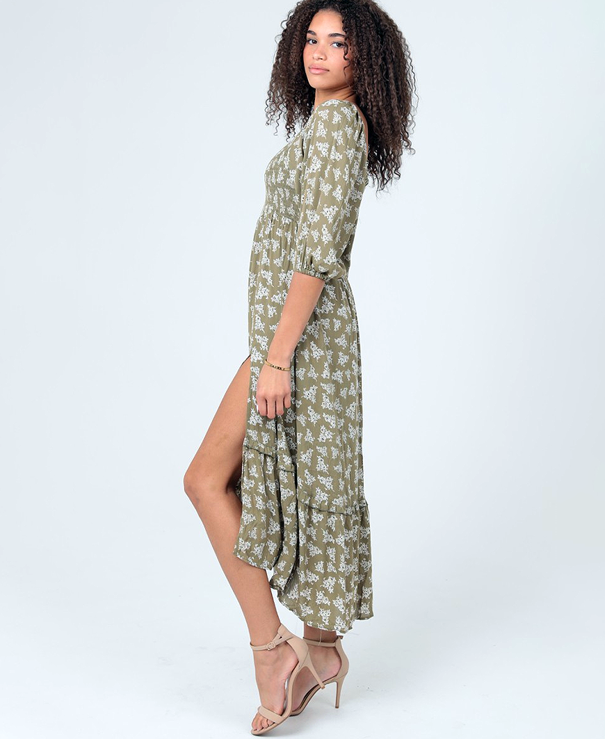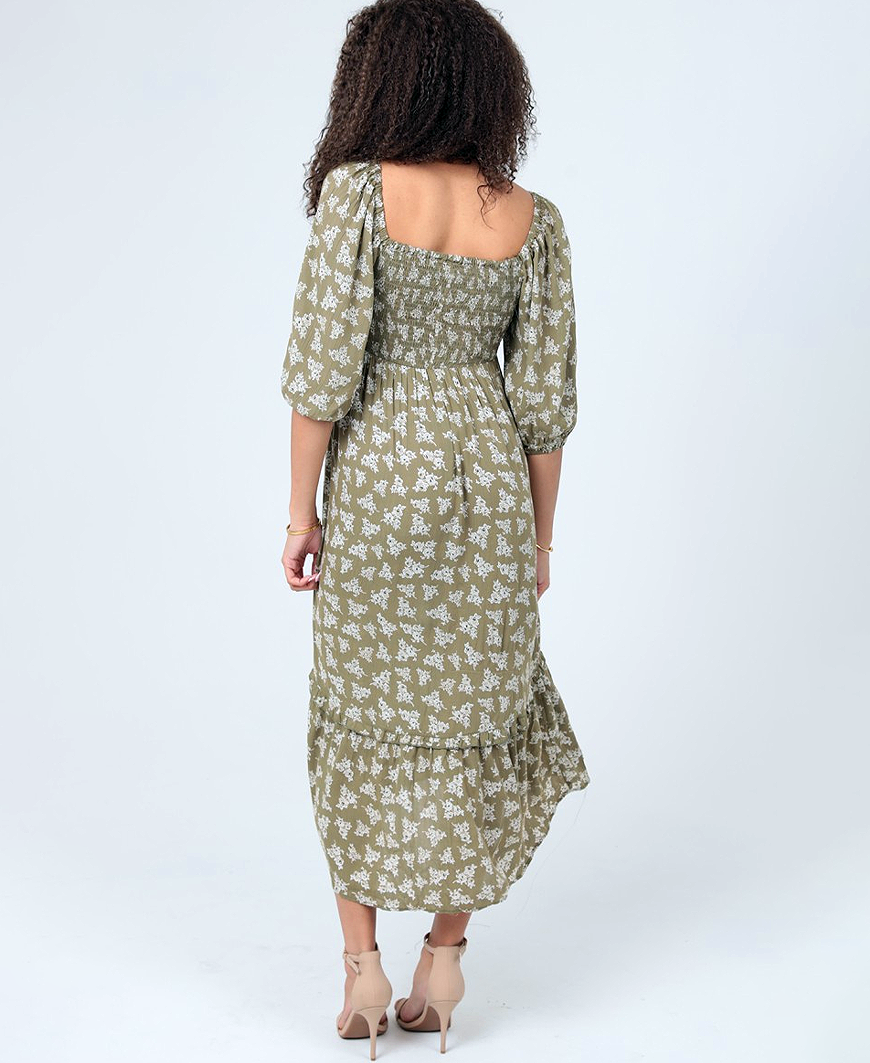 The Rosalia Midi Dress brings effortless charm with its soft floral print and flattering smocked bodice. Designed in a breezy olive tone, this dress features a romantic square neckline, half sleeves with gentle gathers, and a tiered skirt that flows beautifully with every step. The side slit adds a modern touch, offering a subtle hint of allure while keeping the look easy and wearable.
