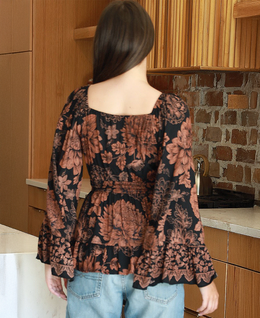 Bring effortless boho charm to your fall wardrobe with the Chana Bell Sleeve Smocked Waist Blouse in black. Featuring a vintage-inspired floral print with rust-colored blooms, this top blends retro style with modern comfort. The smocked waist creates a flattering silhouette, while the flared bell sleeves add a soft, feminine touch.