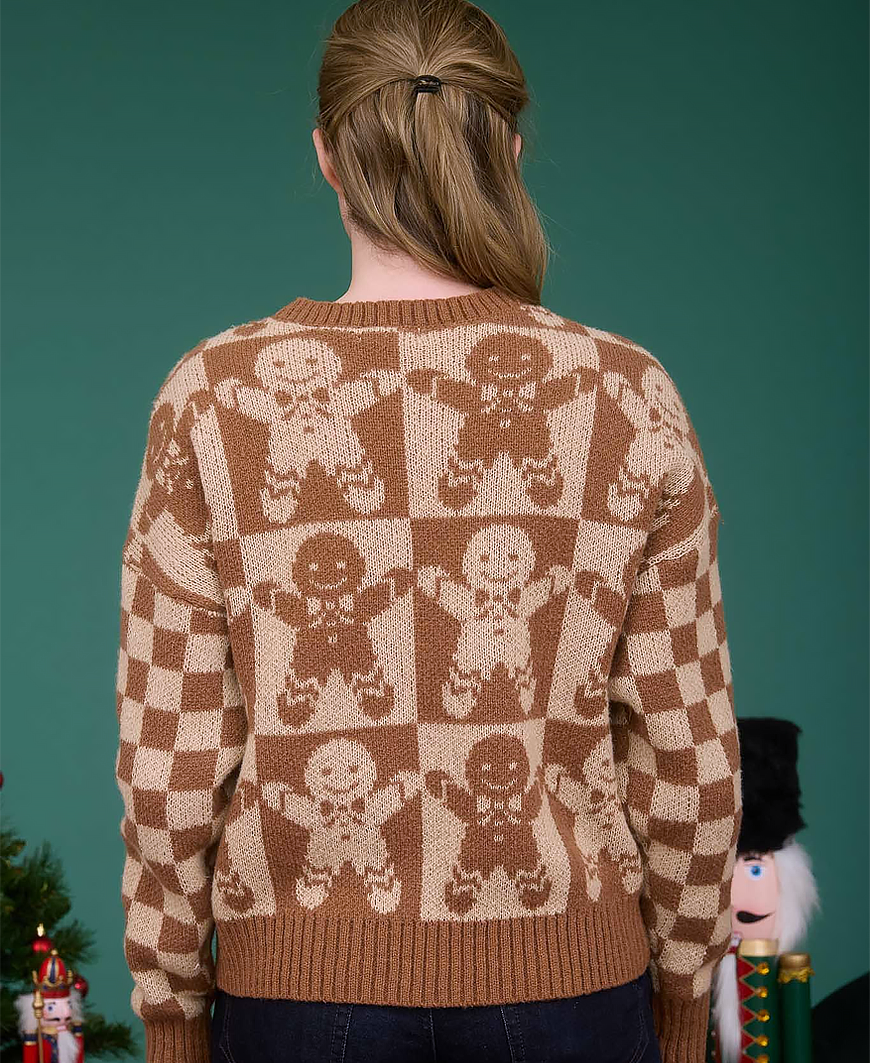 Sweeten up your holiday wardrobe with the Checkered Gingerbread Jacquard Knit Sweater in khaki! This cozy Christmas pullover features an adorable gingerbread design with trendy checkered sleeves and colorblock details for a festive yet stylish look. The relaxed drop-shoulder fit and soft knit fabric make it perfect for staying warm and cute all season long.