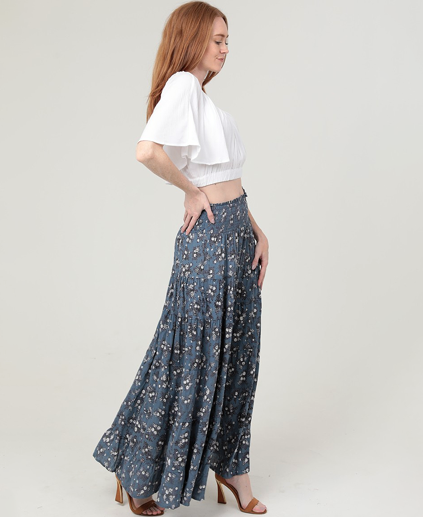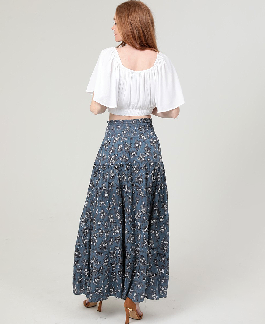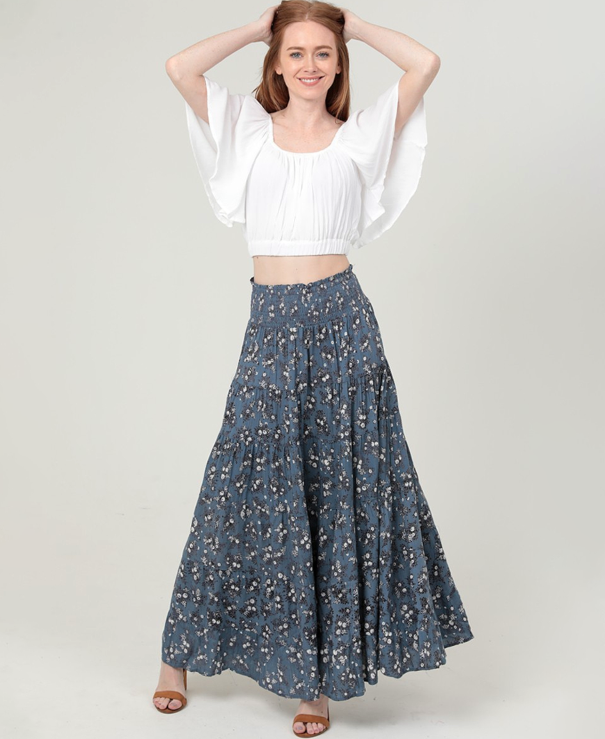 Embrace effortless elegance with the Georgina Maxi Skirt in Denim Blue. This feminine and flattering skirt features a delicate floral ditsy print, adding a touch of vintage charm to your wardrobe. The smocked waistband ensures a comfortable and secure fit, while the tiered design creates a flowing silhouette that moves gracefully with you. Perfect for layering over tights or pairing with a cozy sweater, this skirt is a versatile addition to your fall fashion collection.