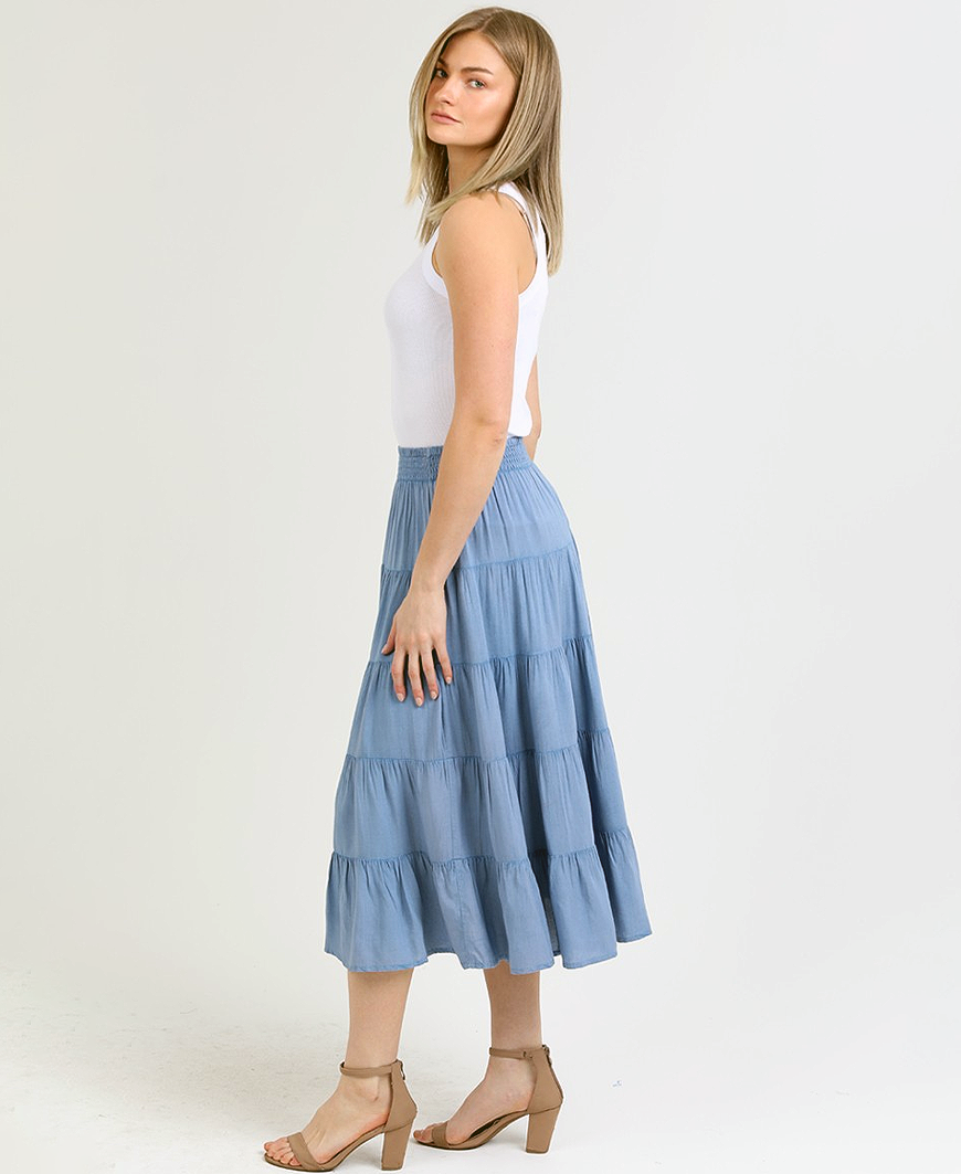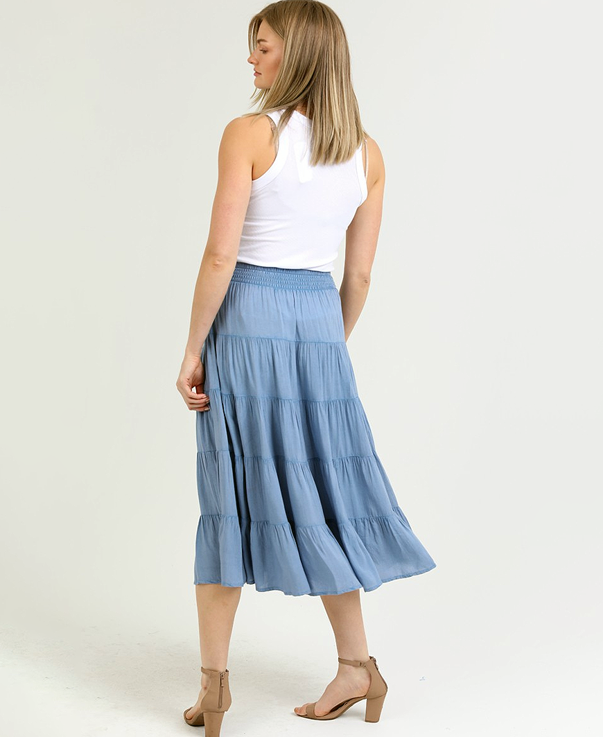 Effortlessly breezy and beautifully feminine, the Gloria Maxi Skirt adds a soft, romantic touch to your everyday style. Designed with a tiered silhouette and comfortable elastic waistband, it flows gracefully with every movement. The lightweight fabric and dreamy blue hue make it a versatile staple you can dress up or down all season long.