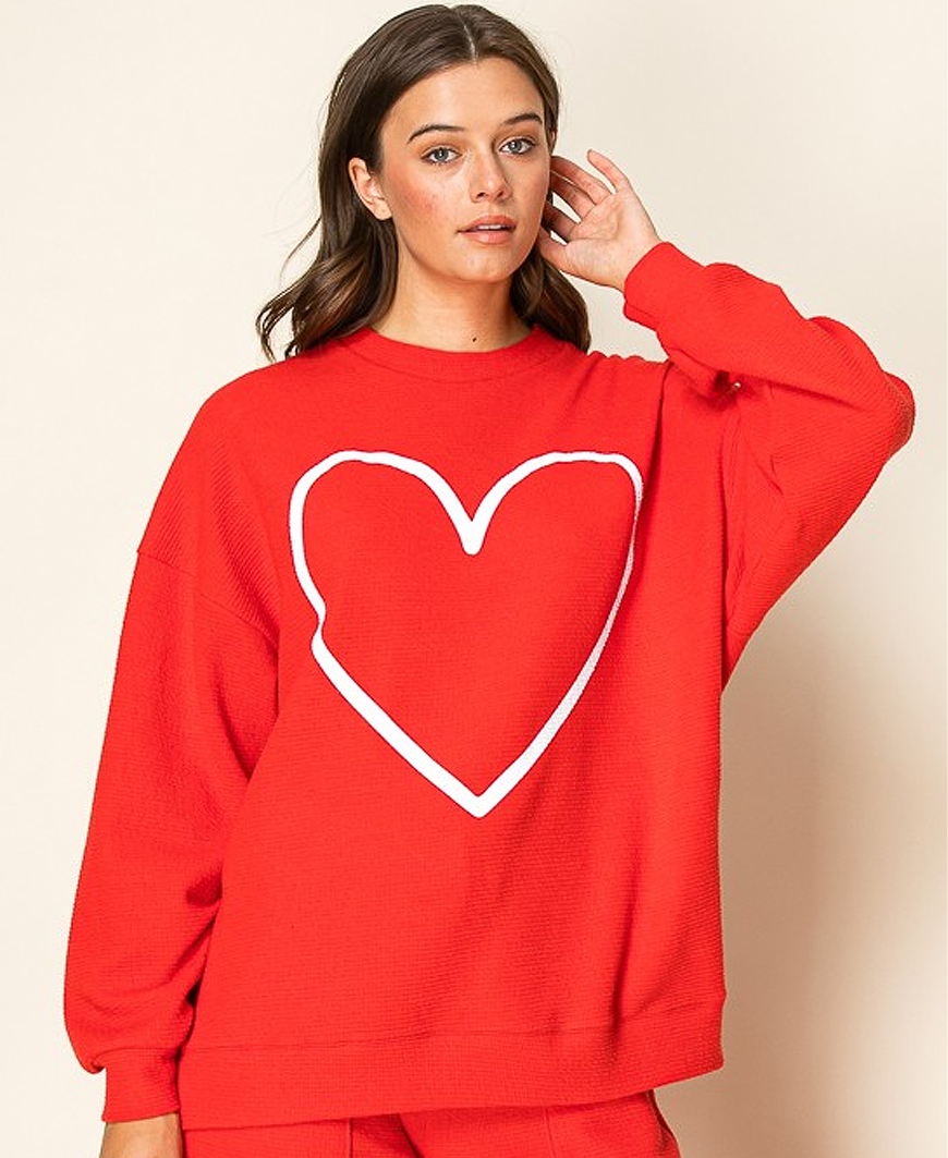 Cozy, cheerful, and perfectly playful—our Heart Outline Cloudy Crewneck is made for feel-good days. This soft long-sleeve knit features a bold heart outline graphic at the front, bringing a cute pop of charm to your everyday style. Designed with a relaxed fit, drop shoulders, and a comfy crew neckline, it’s the perfect throw-on piece for lounging, layering, or adding a sweet touch to your Valentine’s Day lineup.