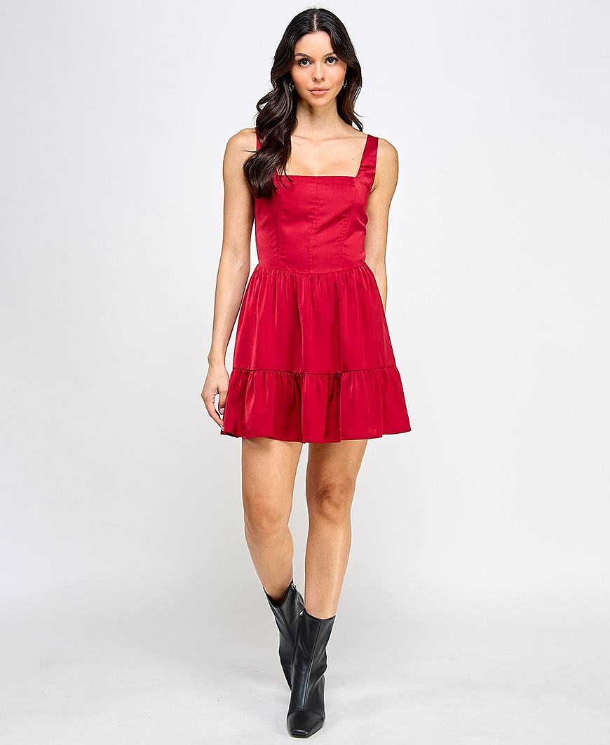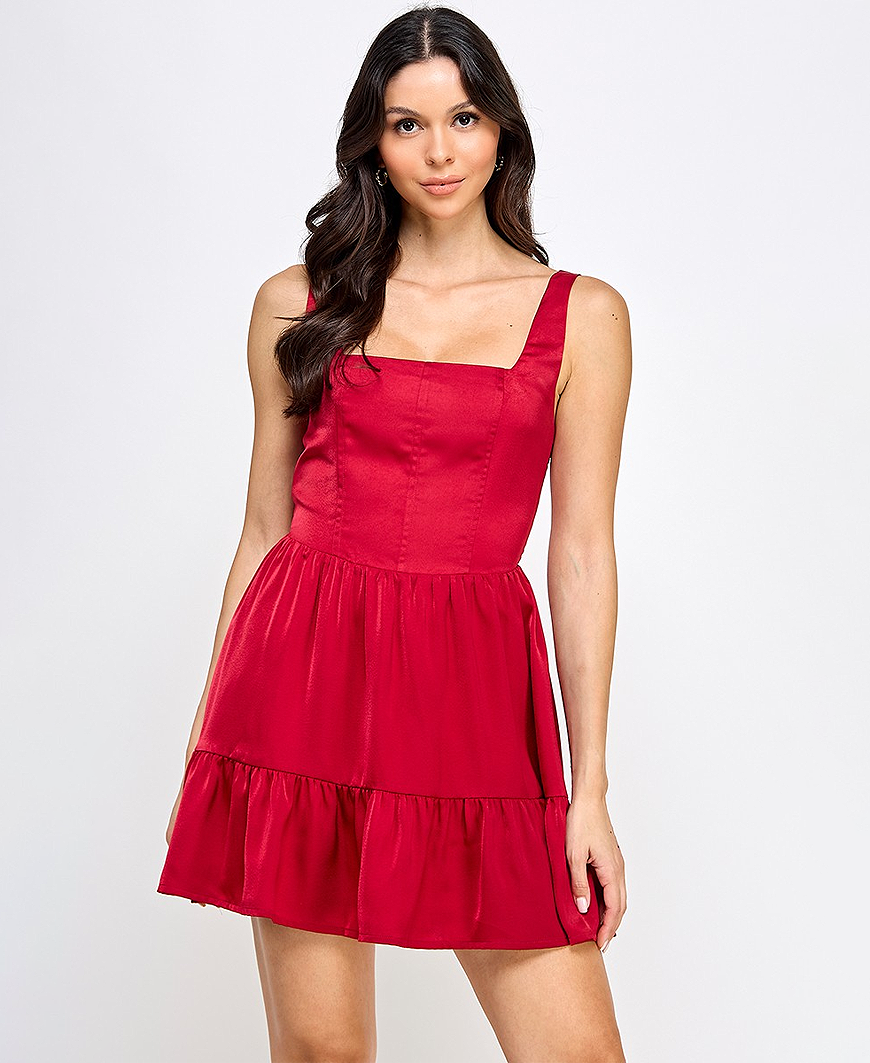 Meet your new statement dress — the Kenna Satin Dress. Crafted in a silky satin fabric with a square neckline and smocked back, this mini dress gives a sleek, flattering fit. The ruffled hem adds the perfect playful touch, making it an easy pick for date nights, parties, or holiday events.