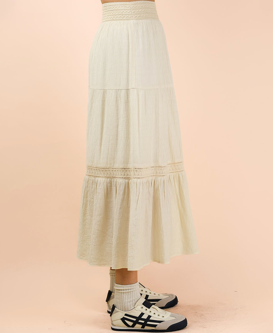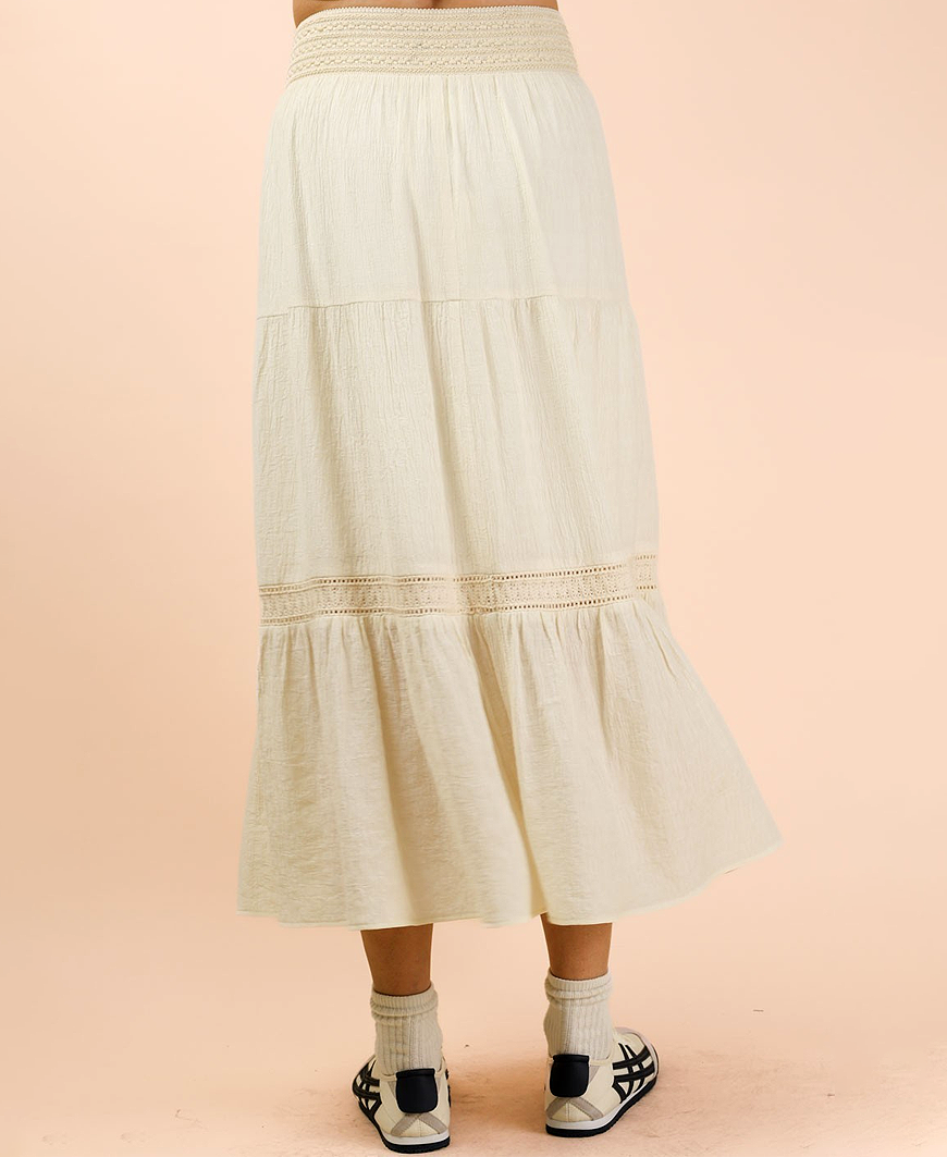 Sweet, feminine, and effortlessly chic — the Lulu Tiered Maxi Skirt in champagne is the perfect piece for your next special moment. Designed with soft tiered layers and delicate lace trim detailing, this woven maxi skirt blends romantic charm with everyday wearability.The elastic waist creates a flattering, comfortable silhouette, while the lightweight woven fabric flows beautifully with every step. Fully lined for coverage and ease, this skirt is perfect for Valentine’s Day, Easter, brunch dates, or spring events.