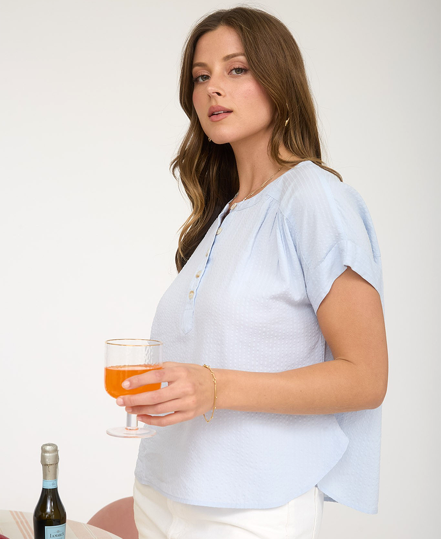 Soft, sunny, and effortlessly chic—the Allegra Ruched Henley Blouse in light blue is the perfect blend of comfort and elevated style. Designed with a flattering boat neckline and classic henley half-button detail, this woven top features subtle ruching at the shoulders for a feminine touch. The solid texture stripe pattern adds visual interest while keeping the look timeless and easy to style. Short sleeves and a relaxed silhouette make this top ideal for warm days, while the back yoke detail enhances fit and movement. Crafted from a breathable rayon-cotton blend, the Allegra Top feels lightweight and comfortable for all-day wear. Dress it up with trousers or keep it casual with your favorite denim—either way, it’s a must-have seasonal staple.