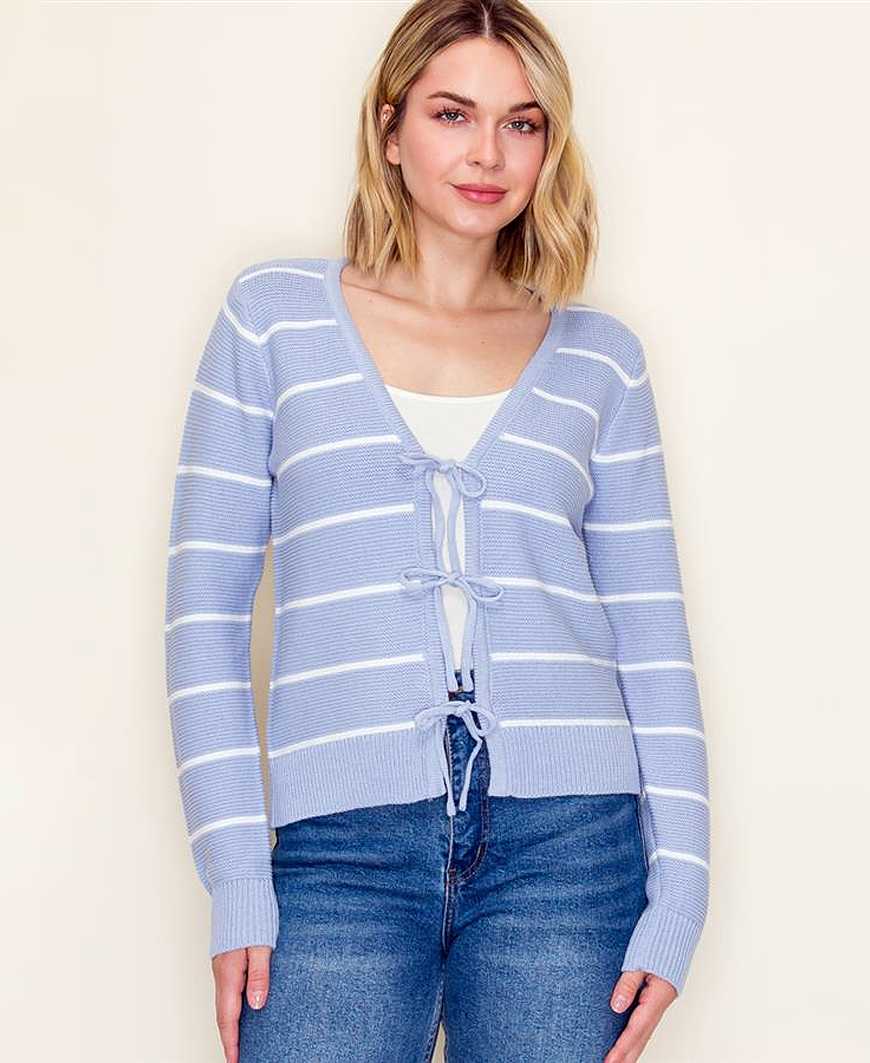 Sweet, soft, and effortlessly feminine—the Ariane Cardigan in light blue and ivory is the perfect layering piece for everyday charm. Designed with a flattering V-neckline and delicate bow tie front closures, this striped sweater cardigan adds a romantic touch to a classic silhouette. The long sleeves and ribbed trim offer cozy comfort, while the lightweight knit keeps it easy and wearable across seasons. Featuring timeless ivory stripes against a soft light blue base, the Ariane Cardigan pairs beautifully with tanks, tees, or dresses. Whether styled casually with denim or layered for a polished look, this cardigan brings a pretty, put-together feel to any outfit.