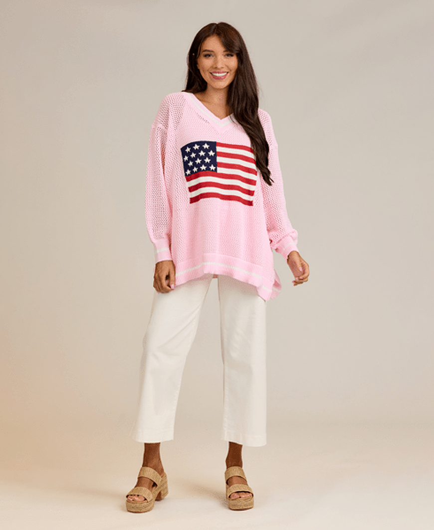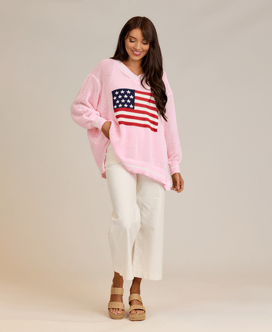 Show off your patriotic style with the American Sweetheart Sweater — a chic Americana-inspired staple perfect for summer nights, holiday weekends, and casual everyday wear. Designed with an airy open knit construction, this sweater offers a breathable, comfortable fit while the flattering V-neckline adds a touch of feminine elegance. A bold jacquard American flag appliqué makes a statement front and center, while varsity stripe detailing along the ribbed neckline, cuffs, and hem adds a sporty, classic finish.