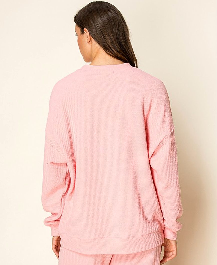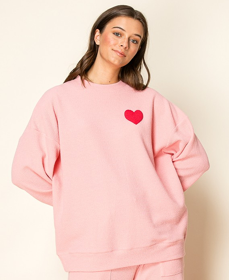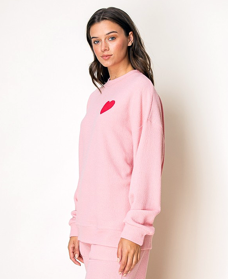 Love is in the air! Sweet and effortlessly cozy, the Corner Heart Crewneck is the perfect blend of comfort and charm. Designed in a soft blossom pink hue, this long sleeve knit features a subtle heart detail at the corner for a playful, feminine touch. The cloudy-soft fabric and relaxed fit make it an easy go-to for lounging, layering, or casual everyday wear. Style it with denim, leggings, or cozy bottoms for a look that feels as good as it looks.