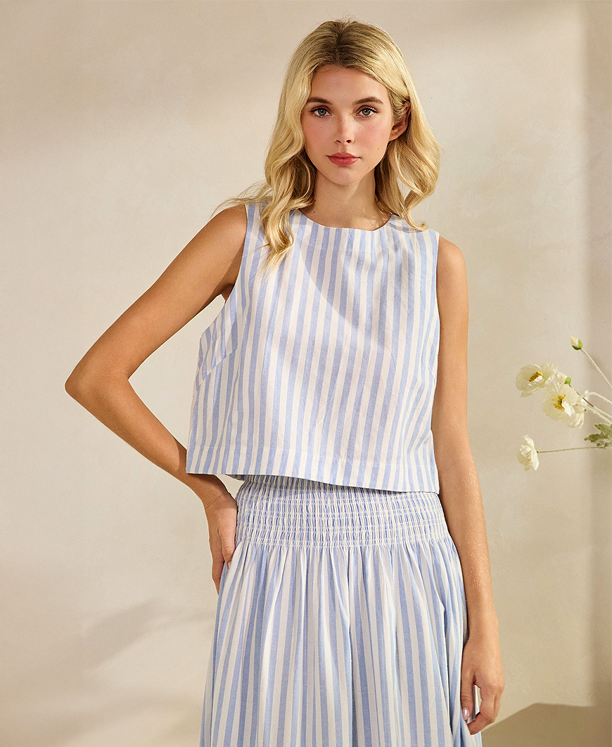 Fresh, light, and effortlessly polished, the Callan Stripe Sleeveless Top in blue is a must-have for spring styling. Designed with classic vertical stripes and a flattering cropped silhouette, this sleeveless woven top offers a clean, modern look that pairs perfectly with high-waisted denim, tailored shorts, or the matching Callan Stripe Skirt (sold separately). The breezy fit makes it ideal for warm-weather days, brunch dates, and vacation outfits.