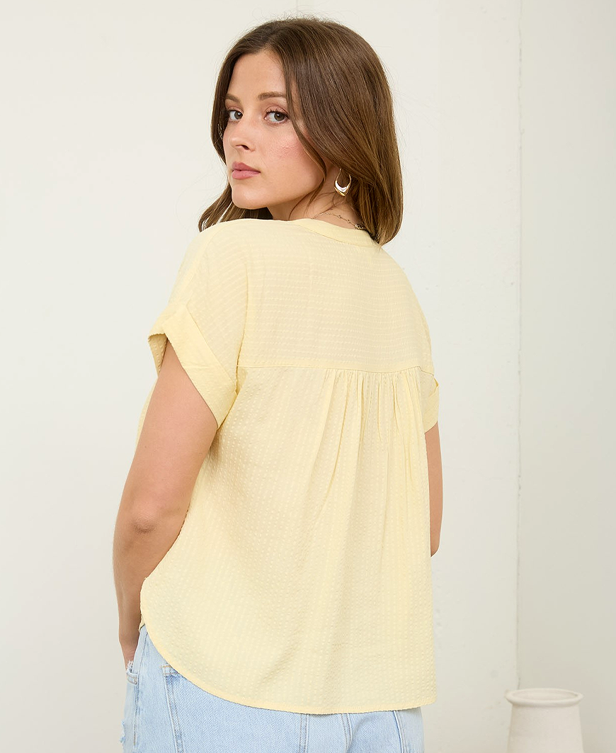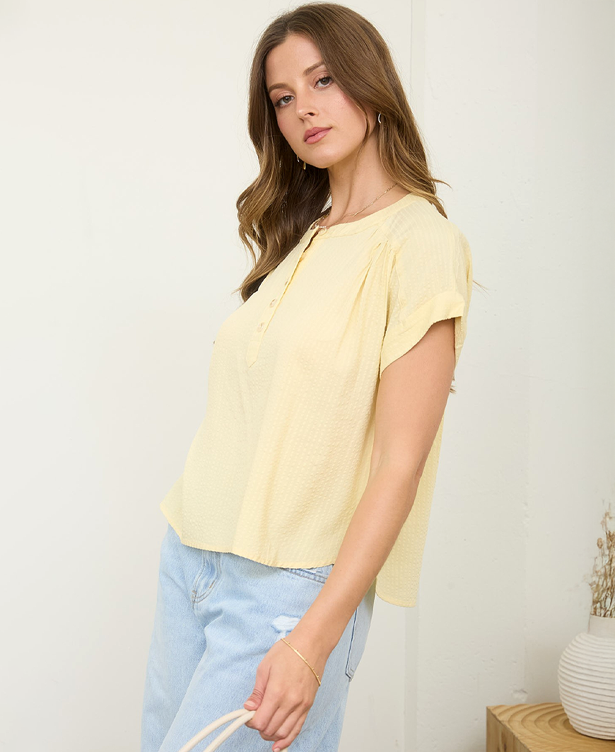 Soft, sunny, and effortlessly chic—the Allegra Ruched Henley Blouse in butter yellow is the perfect blend of comfort and elevated style. Designed with a flattering boat neckline and classic henley half-button detail, this woven top features subtle ruching at the shoulders for a feminine touch. The solid texture stripe pattern adds visual interest while keeping the look timeless and easy to style. Short sleeves and a relaxed silhouette make this top ideal for warm days, while the back yoke detail enhances fit and movement. Crafted from a breathable rayon-cotton blend, the Allegra Top feels lightweight and comfortable for all-day wear. Dress it up with trousers or keep it casual with your favorite denim—either way, it’s a must-have seasonal staple.