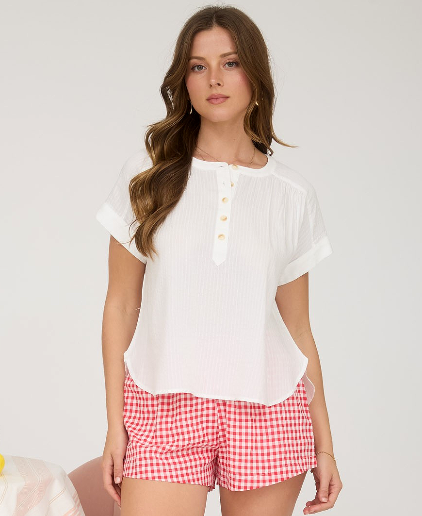 Soft, sunny, and effortlessly chic—the Allegra Ruched Henley Blouse in white is the perfect blend of comfort and elevated style. Designed with a flattering boat neckline and classic henley half-button detail, this woven top features subtle ruching at the shoulders for a feminine touch. The solid texture stripe pattern adds visual interest while keeping the look timeless and easy to style. Short sleeves and a relaxed silhouette make this top ideal for warm days, while the back yoke detail enhances fit and movement. Crafted from a breathable rayon-cotton blend, the Allegra Top feels lightweight and comfortable for all-day wear. Dress it up with trousers or keep it casual with your favorite denim—either way, it’s a must-have seasonal staple.