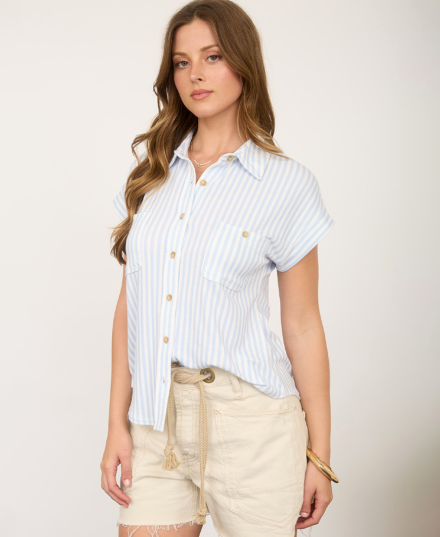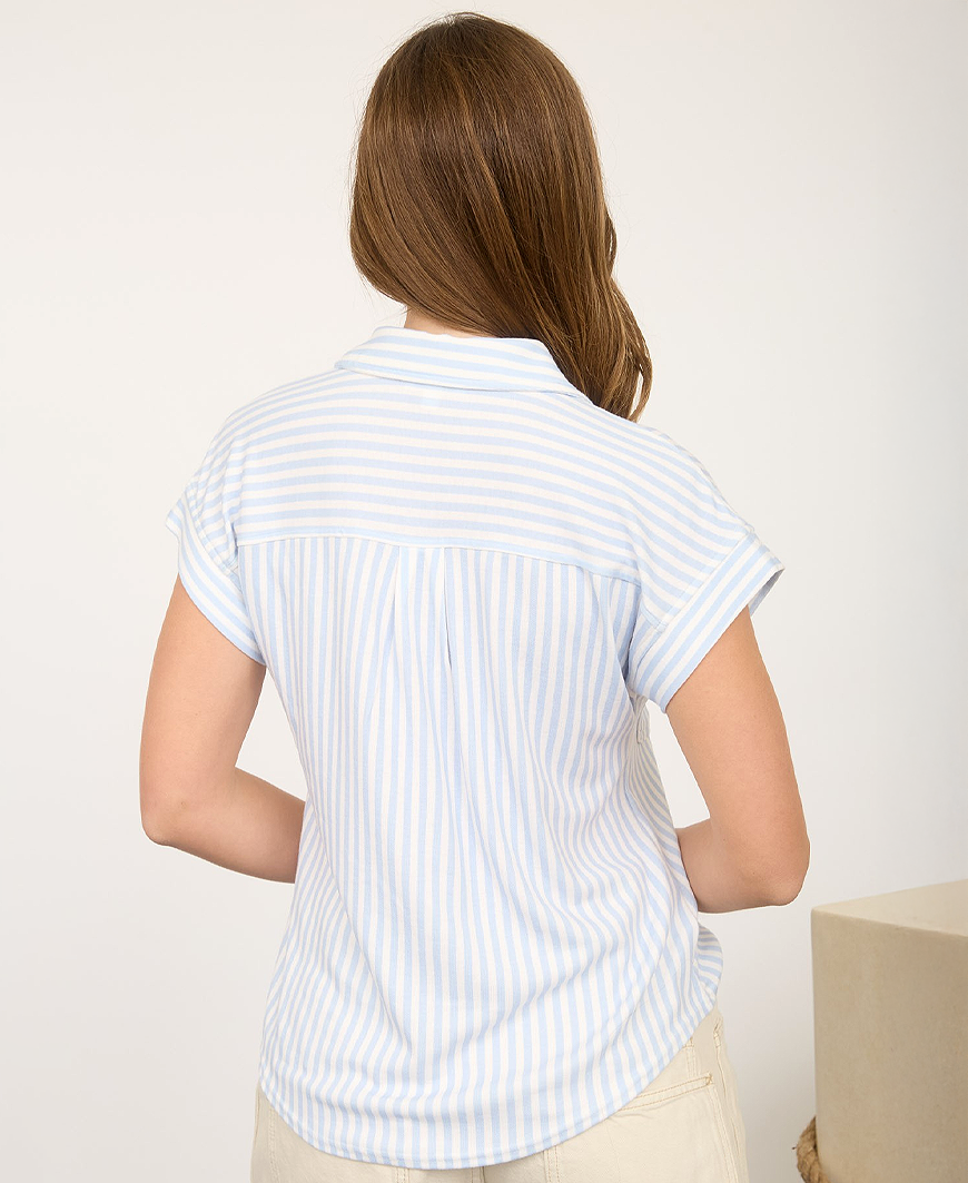 The Arrow Stripe Collared Top is a timeless wardrobe staple with an easy, polished feel. Designed with a classic collar and short sleeves, this woven top features a vertical stripe pattern that elongates the silhouette. A functional chest pocket with button detail adds a subtle utility touch, while the lightweight fabric offers comfortable stretch for all-day wear. Perfect for styling with denim, trousers, or layered under a cardigan, this versatile button-down transitions seamlessly from casual days to more refined looks.