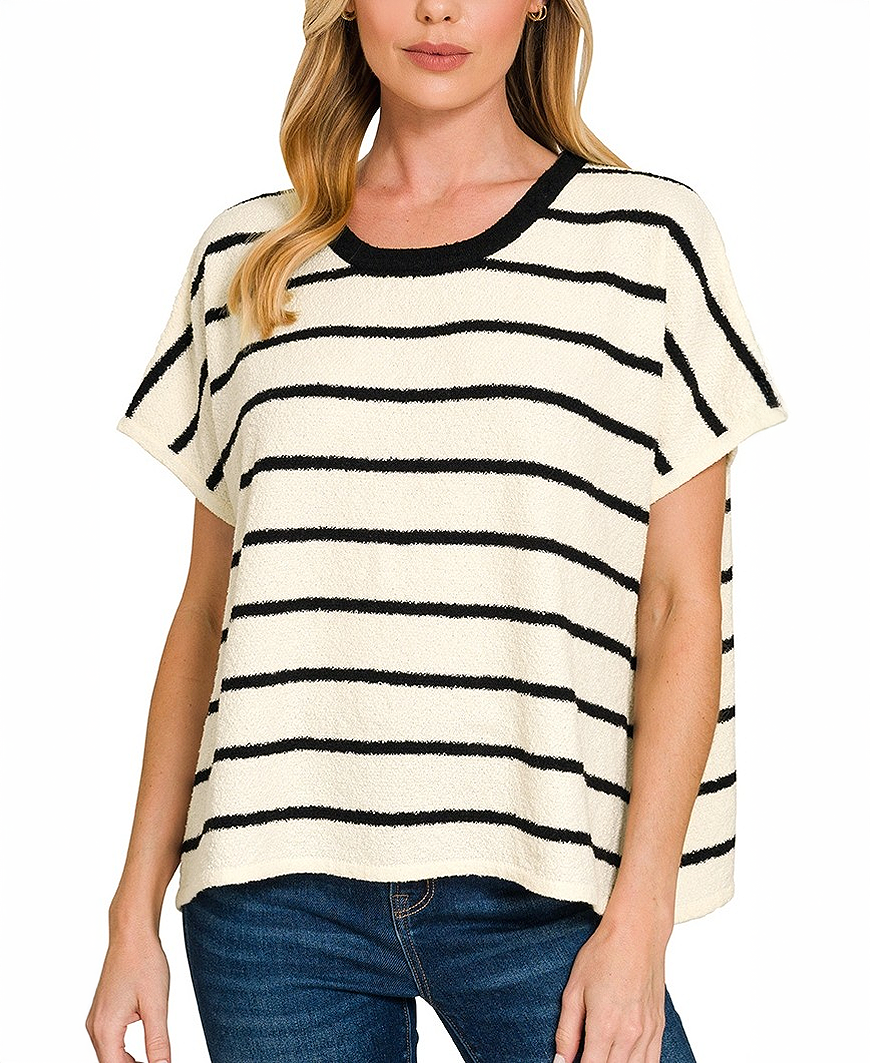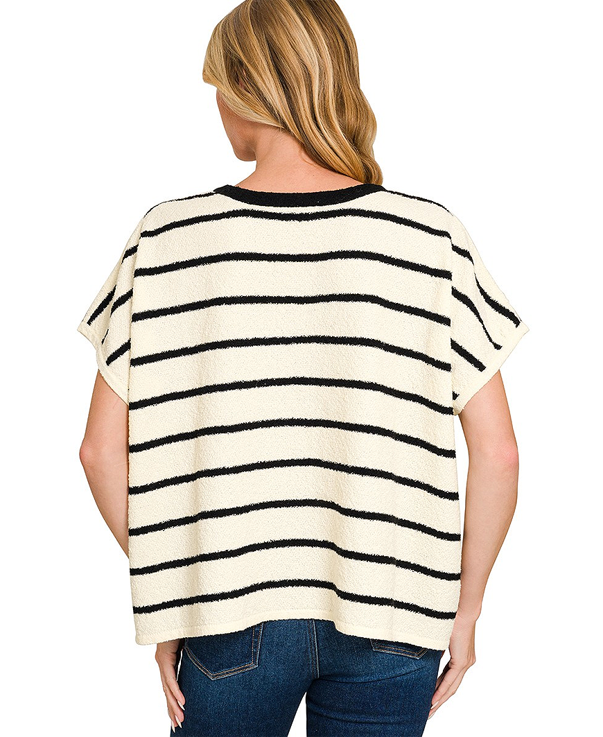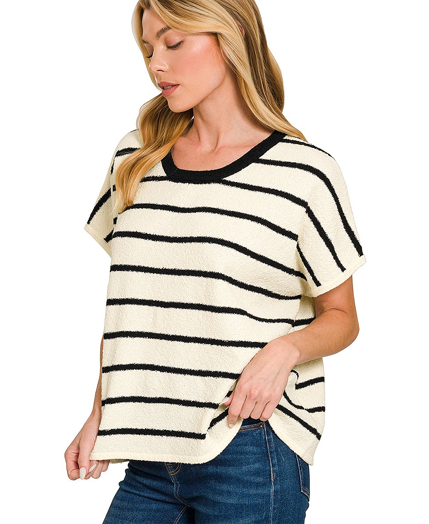 The Flynn Striped Top is your go-to for effortless, everyday comfort. Designed with an oversized fit and classic black stripes, this lightweight sweater top delivers a relaxed silhouette that feels cozy without being bulky. The soft knit texture and easy drape make it perfect for casual days when you still want to look put together. Style it with your favorite denim for a laid-back look, or layer it under a jacket for easy seasonal transitions.