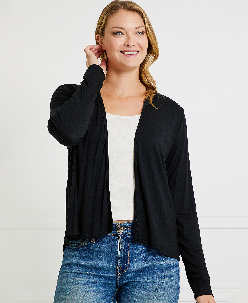 The Maude Go-To Cardigan is a timeless layering essential you’ll reach for again and again, offered in black and white. Designed with long sleeves and the perfect everyday length, this soft knit cardigan drapes beautifully over any outfit. The stretchy rayon blend offers lightweight comfort while maintaining a polished look, making it ideal for year-round wear.