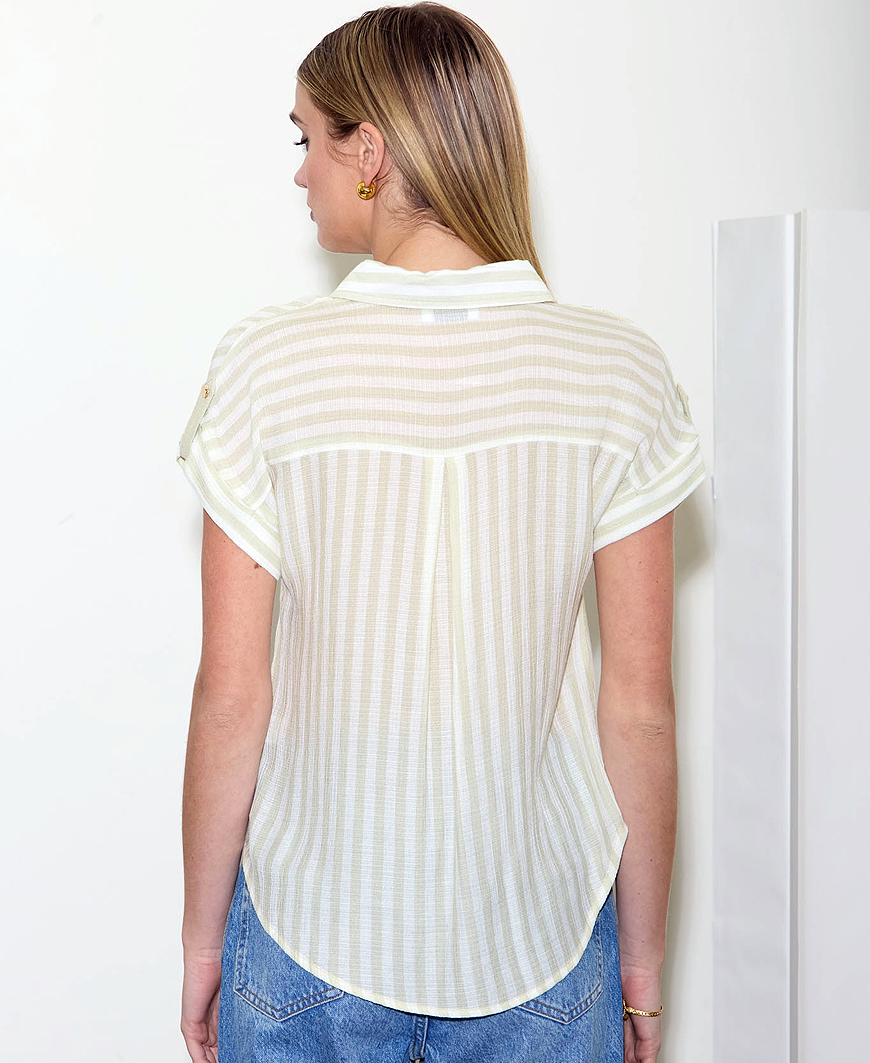 Meet your new go-to for effortless everyday style—the Suki Striped Woven Top in light olive. Designed with a classic collared neckline and front button-down closure, this top blends timeless stripes with a relaxed, modern silhouette. The short dolman sleeves with button tab detailing add an elevated touch while keeping the fit easy and breathable. Crafted from a lightweight woven fabric, the Suki Top drapes beautifully and feels comfortable all day long.
