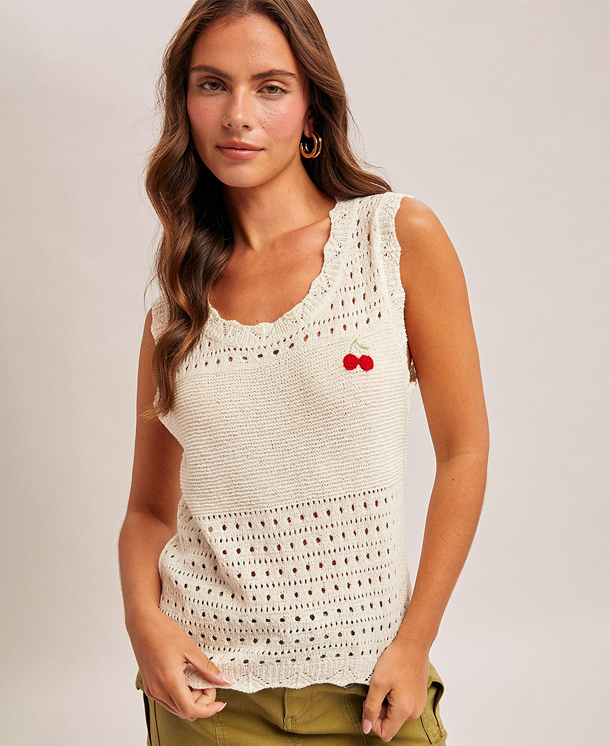 Sweet, playful, and effortlessly chic, the Cherry Embroidered Knit Tank in Off White is the perfect blend of cozy and cute for spring and summer. Designed with a lightweight knit and delicate open-stitch detailing, this sweater tank offers a breathable, airy feel while keeping your look polished and feminine.The dainty cherry embroidery adds a fun, whimsical pop of color, making this top a standout piece for casual days, brunch dates, or weekend outings.