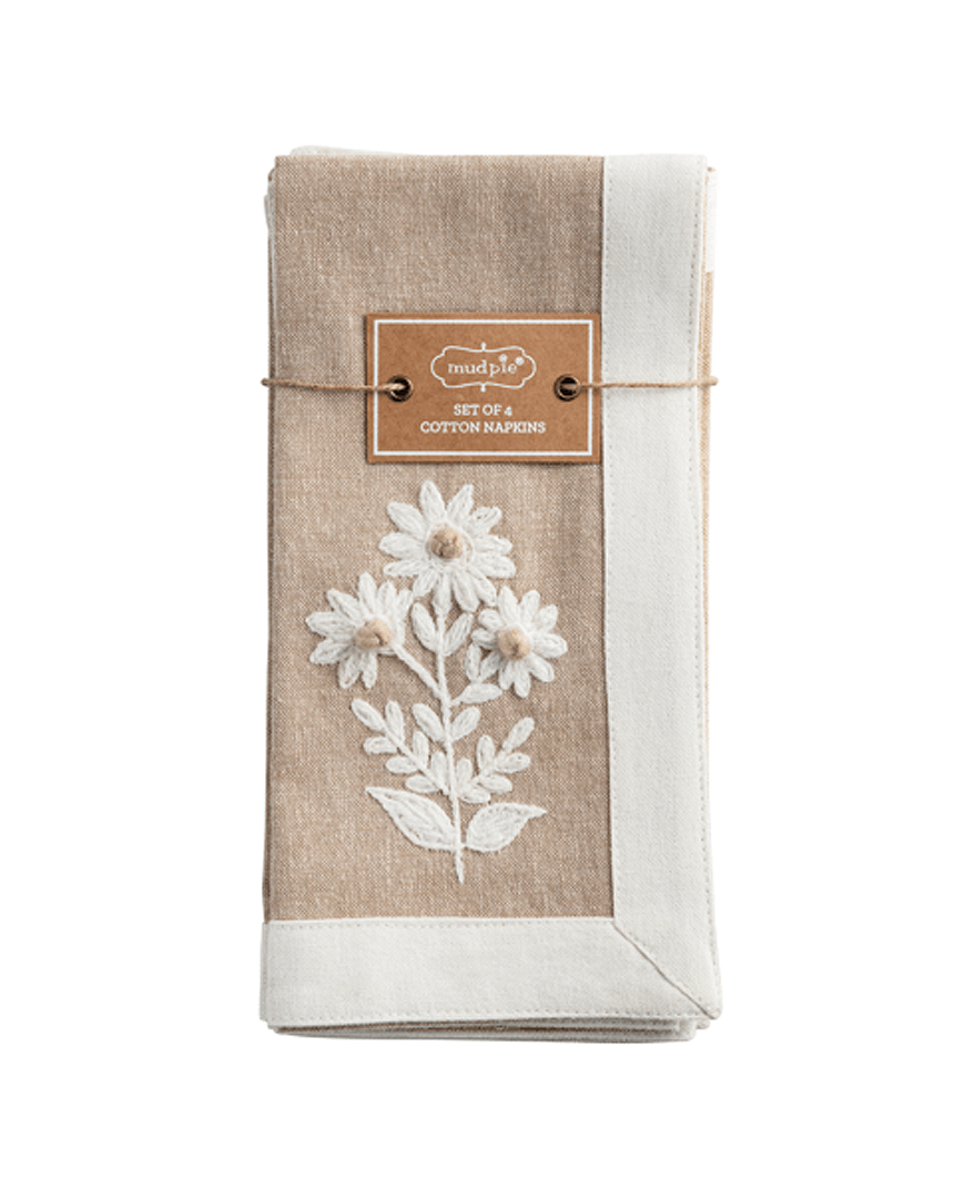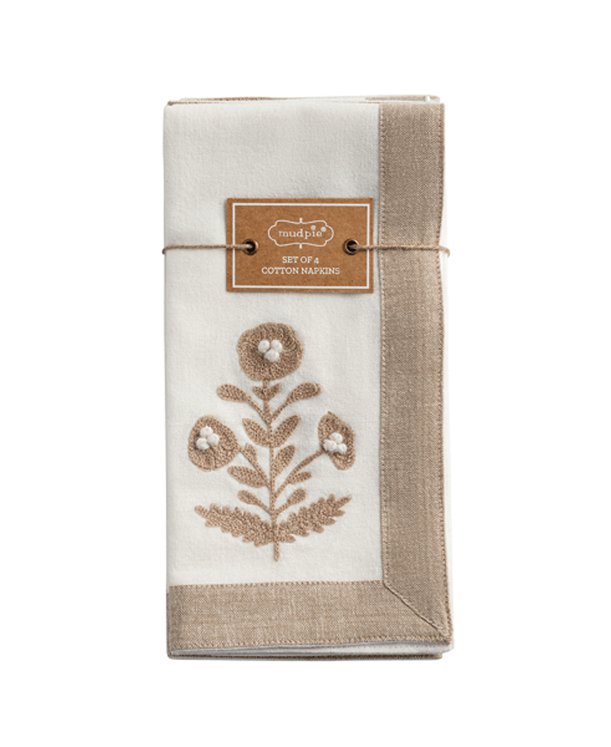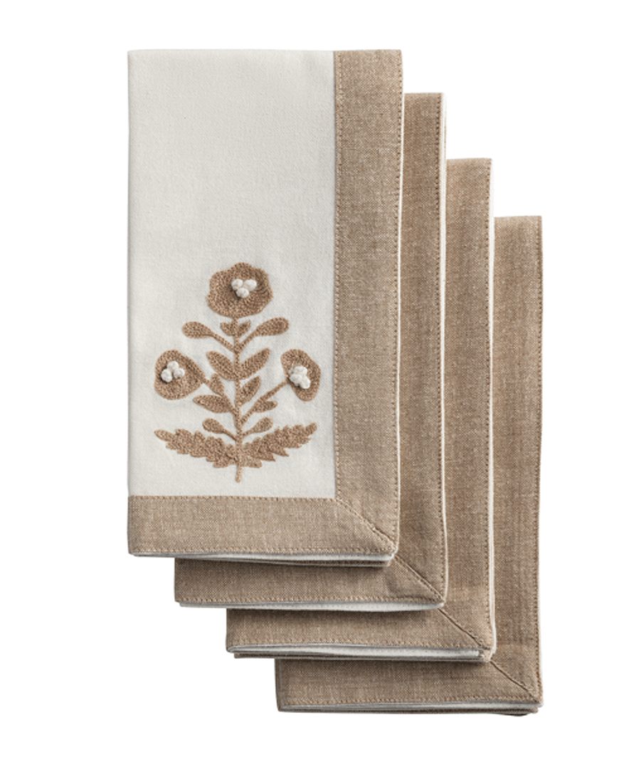 Elevate your table setting with the Embroidered Napkin Pack, available in timeless Tan or classic Cream. This beautifully curated set includes four dinner napkins crafted from 100% cotton, offering a soft, durable feel with excellent absorbency. Each napkin features delicate French knot floral embroidery in the corner, adding a refined and sophisticated touch to both everyday meals and special occasions. Measuring 18" x 18", these generously sized cloth napkins bring effortless elegance to dinner parties, holiday gatherings, or intimate meals at home.