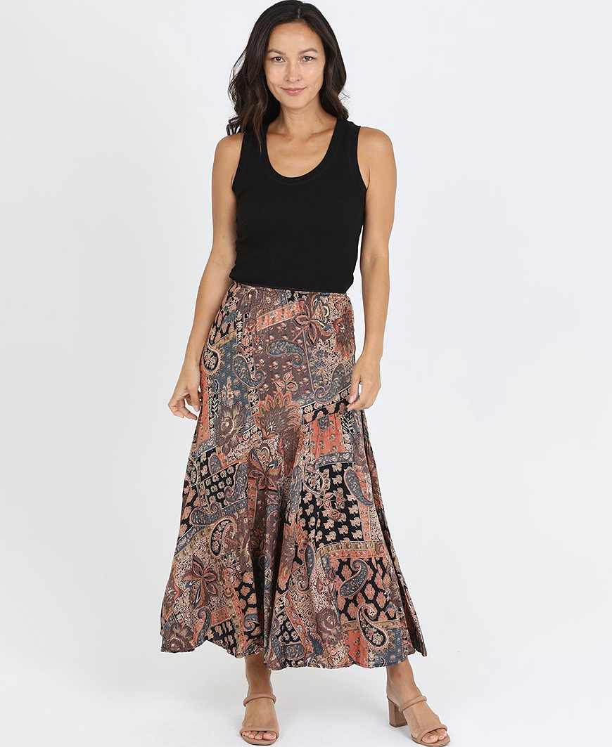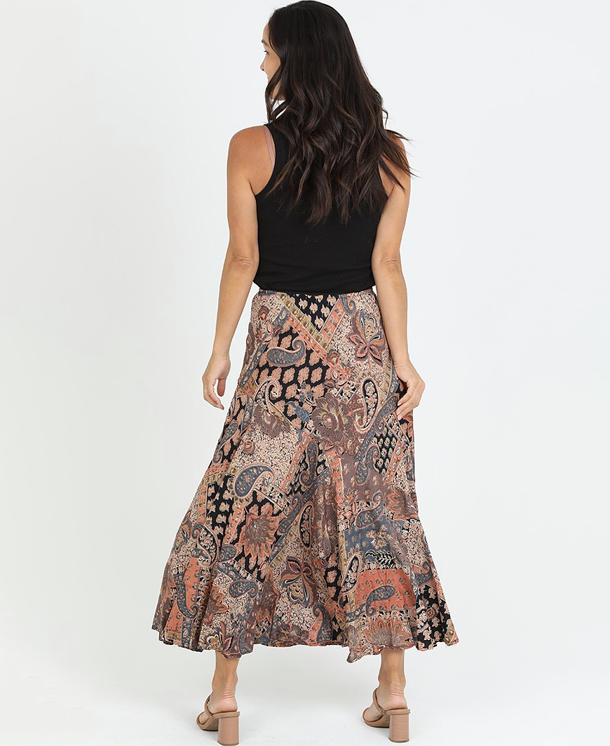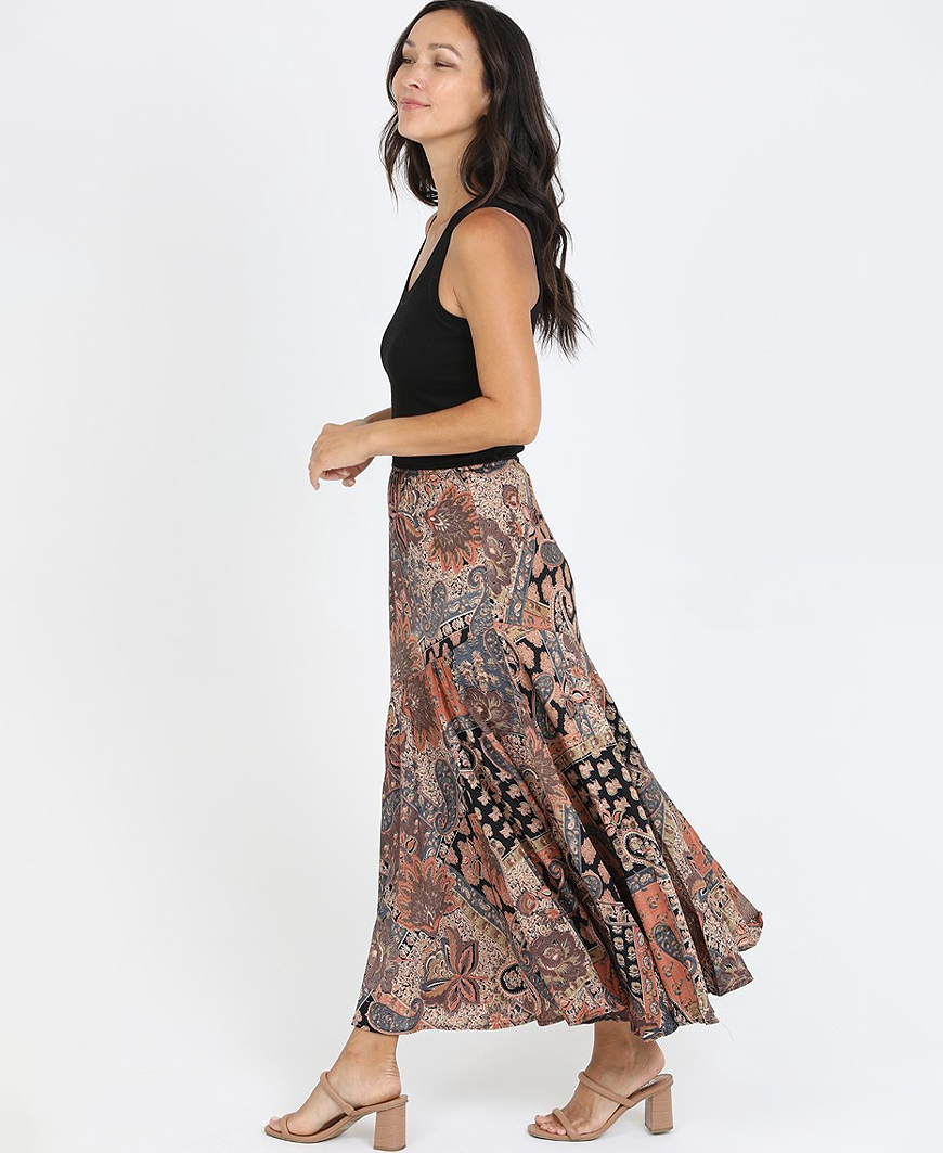 Boho-inspired and effortlessly elegant, the Estelle Maxi Skirt is your new go-to for flowy, feminine style. This printed maxi features a rich mix of earthy tones and paisley patterns for a timeless look that’s perfect year-round. The soft, lightweight fabric and flattering flow make it easy to dress up or down — pair it with a tank, tee, or chunky knit for endless styling possibilities.