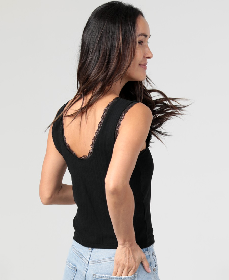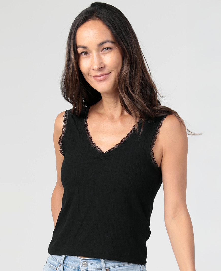 The Flora Tank Top is a classic wardrobe staple with a romantic twist. Crafted from soft rib knit fabric, it features a cinched bust and delicate lace trim that add feminine charm to your everyday look. Pair it with jeans, skirts, or layered under a cozy cardigan for effortless style from season to season.