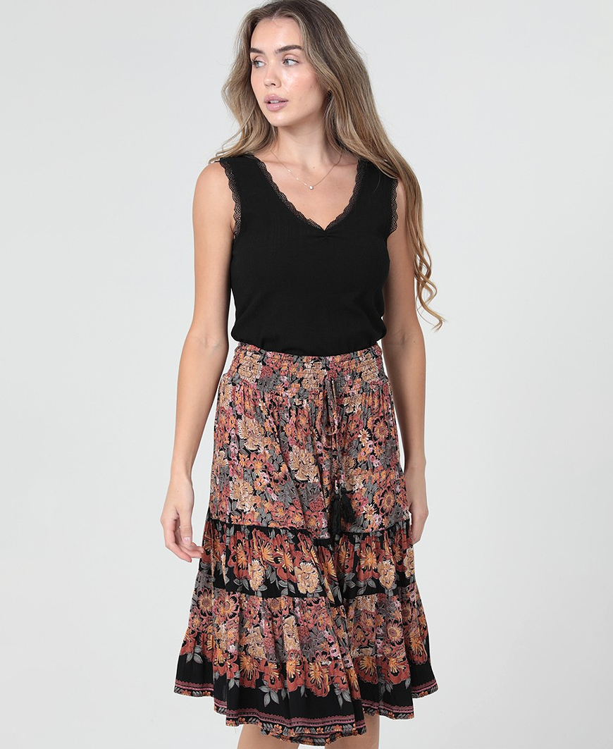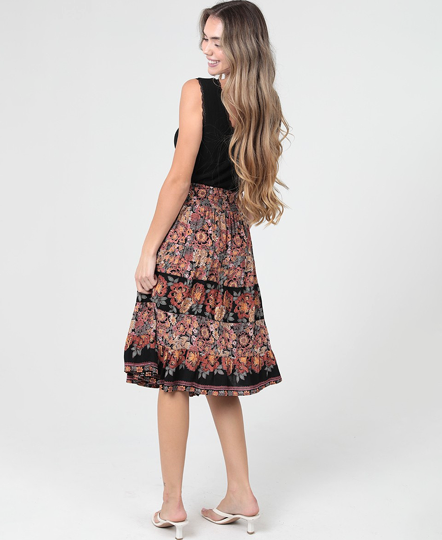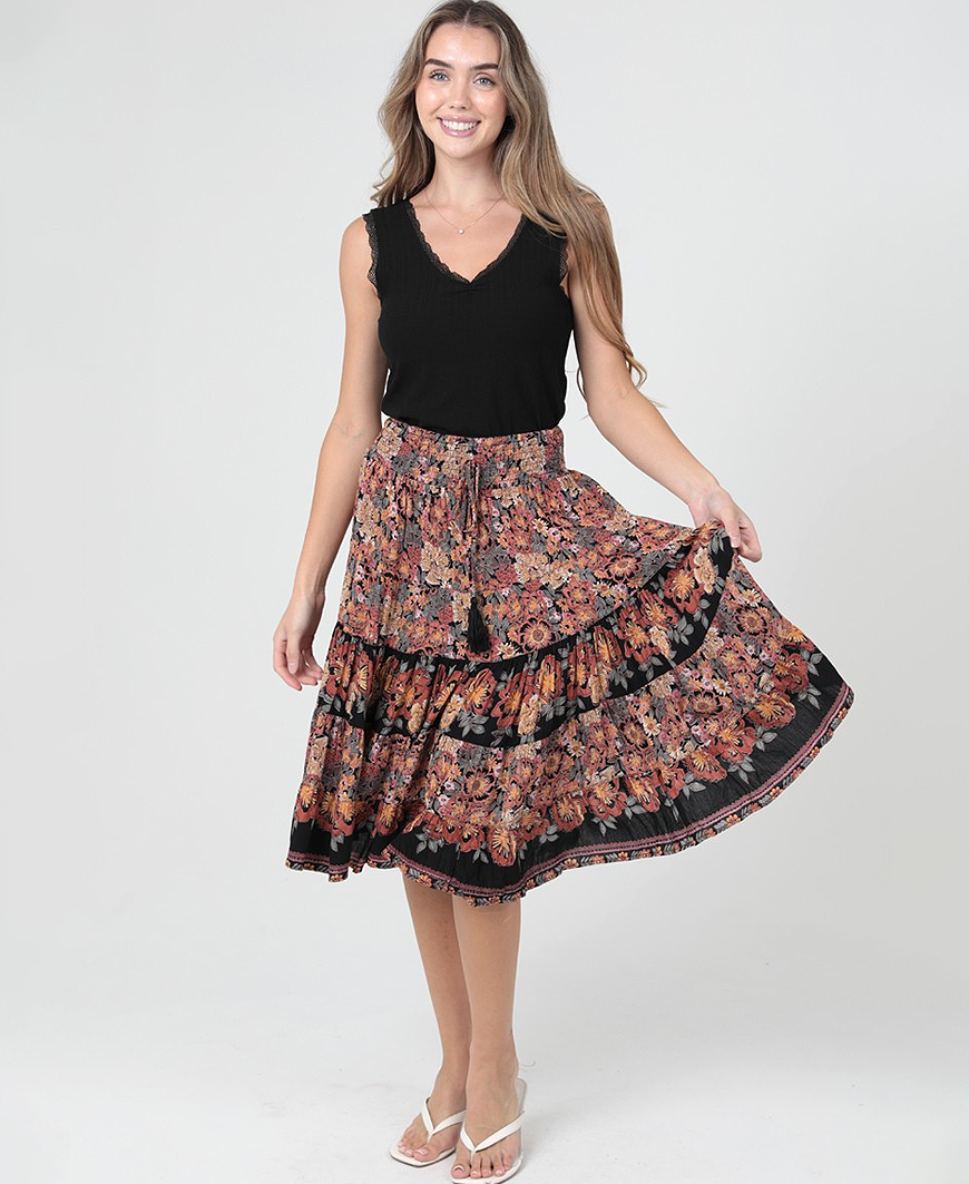Effortlessly feminine and perfect for every season, the Irene A-Line Skirt features a beautiful floral print in warm, autumn-inspired tones. Designed with a flattering smocked waistband and a tiered silhouette, this skirt flows with every step while offering a comfortable, flexible fit.
