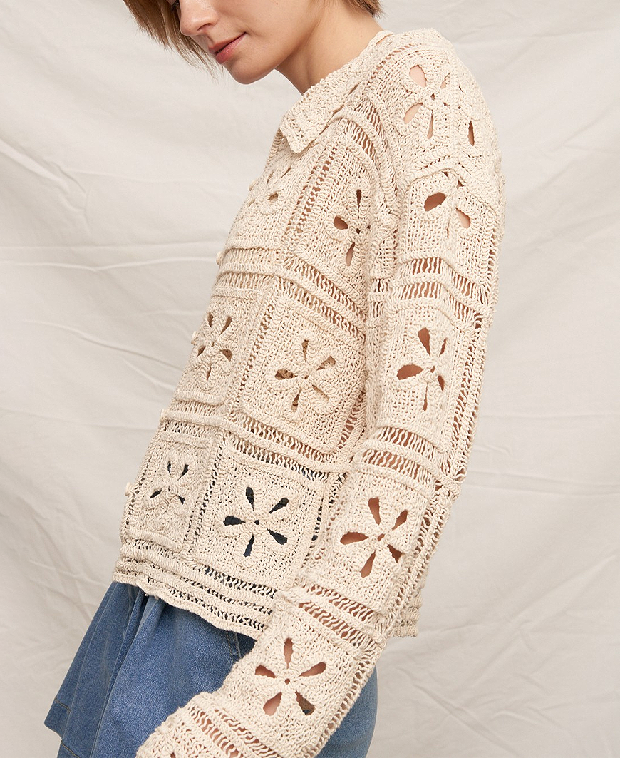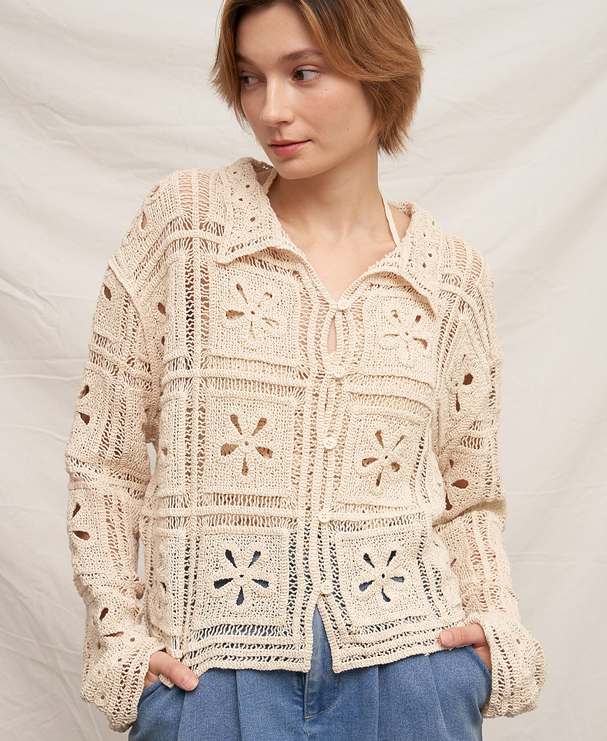 Light, airy, and effortlessly elevated — the Lindie Crochet Cardigan Top is the perfect layering piece for any season. Designed in a soft neutral beige, this 100% cotton crochet knit brings beautiful texture and timeless charm to your everyday wardrobe. Featuring a classic collared neckline, long sleeves, and a relaxed silhouette, this one-size cardigan top blends vintage-inspired detail with modern versatility. The breathable open-knit crochet design makes it perfect for layering over tanks, dresses, or bralettes for an easy boutique look.