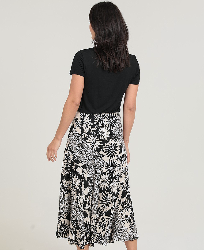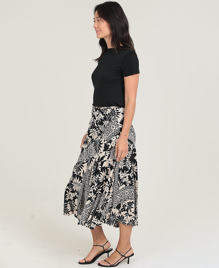 The Paislee Skirt brings a breezy, effortless vibe to your everyday look. Featuring a bold mix of geometric and tropical-inspired prints, this flowy A-line skirt is perfect for pairing with your favorite basic tee or a lightweight sweater. The elastic waistband offers all-day comfort, while the soft, drapey fabric moves beautifully with every step.