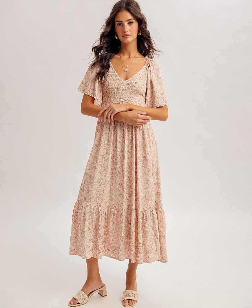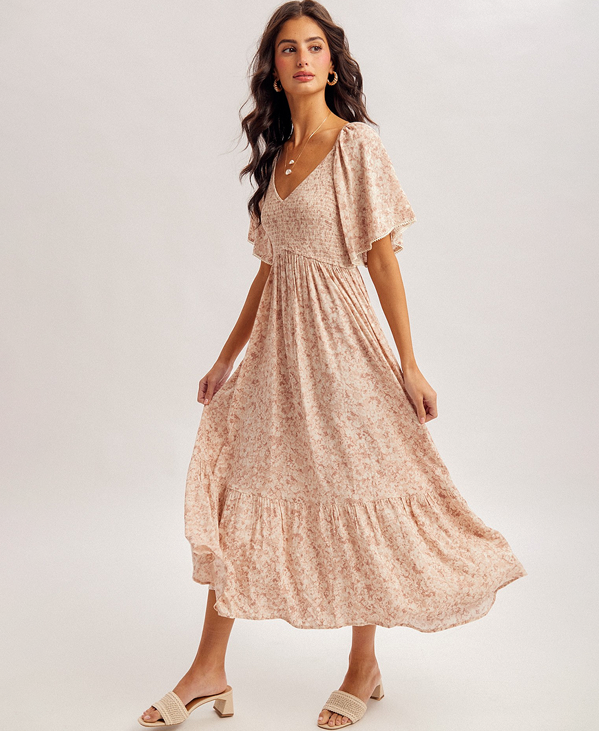 Romantic, flowy, and effortlessly feminine, the Pippa Flutter Sleeve Floral Dress in Mauve is your perfect go-to for spring and summer days. Featuring a delicate ditsy floral print, this maxi dress is designed with a smocked chest for a flattering, comfortable fit and flutter sleeves that add a soft, airy touch. The ruffled hem creates beautiful movement with every step, while the lightweight rayon fabric keeps you cool and breezy—perfect for everything from brunch dates to vacations and special occasions.