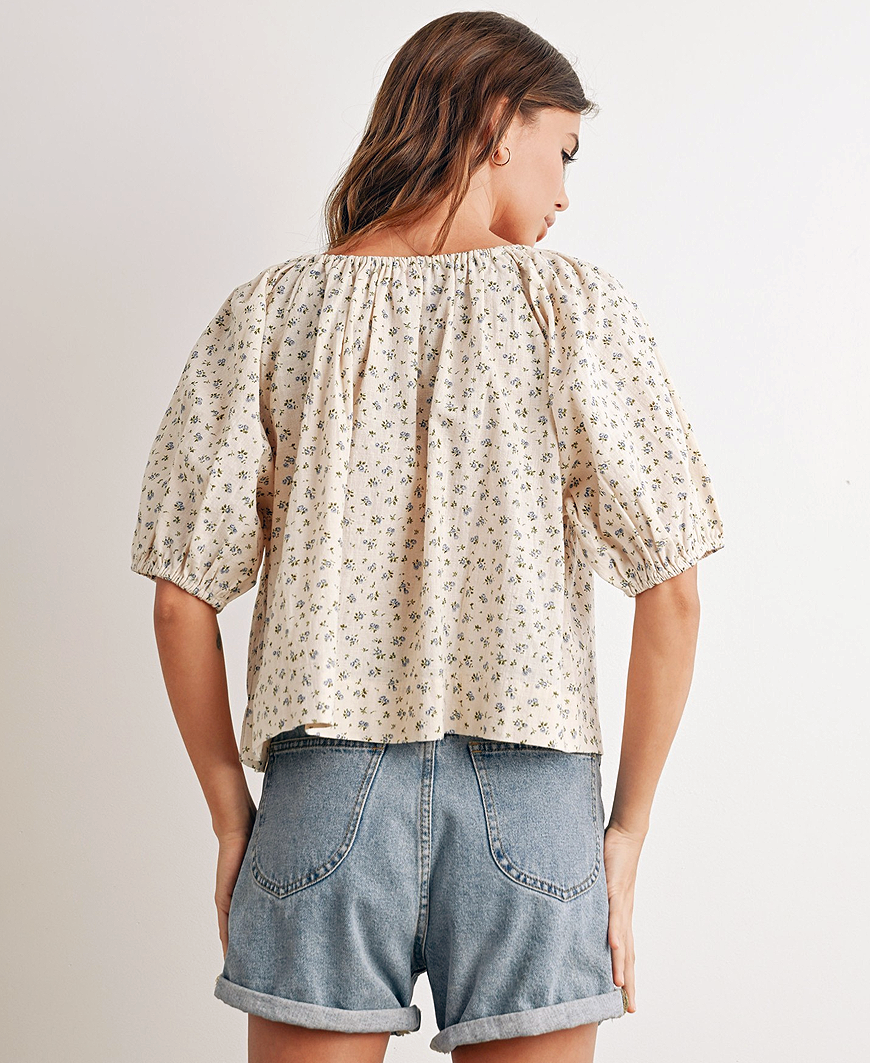 Sweet, breezy, and effortlessly feminine, the Polly Puff Sleeve B louse in Taupe is a charming staple for your everyday wardrobe. Featuring a delicate blue floral print on a soft taupe background, this top brings a subtle pop of color while keeping your look timeless and romantic. Designed with airy puff sleeves and a relaxed fit, it offers all-day comfort with a flattering silhouette. The tie-front detail adds a touch of playful sweetness, making it perfect for casual days, brunch dates, or sunny picnics. 🌷