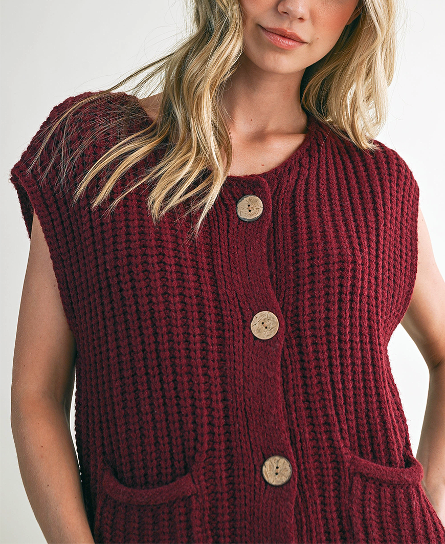 Regular price $56.00 Sale price $46.99Reyna Button Detail Sleeveless Sweater – Burgundy