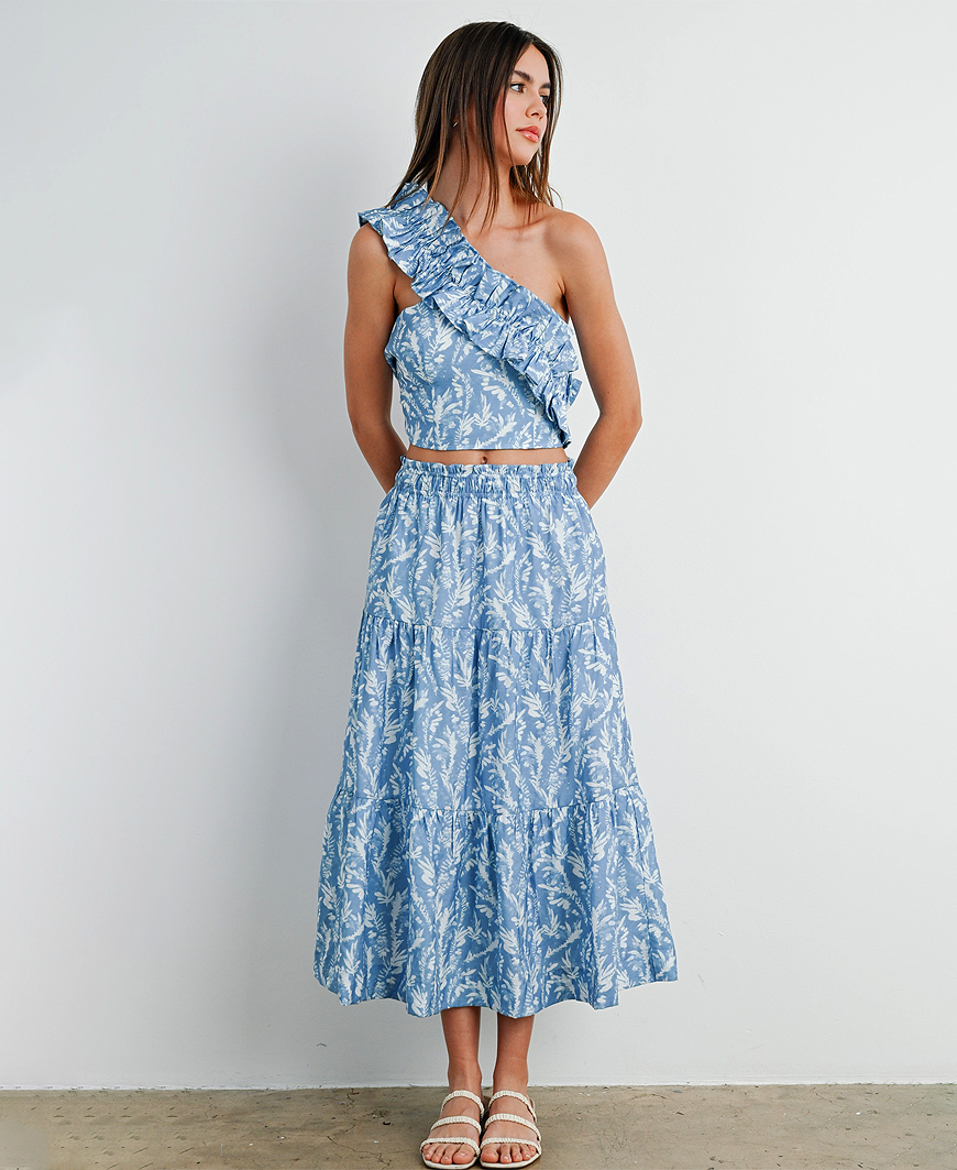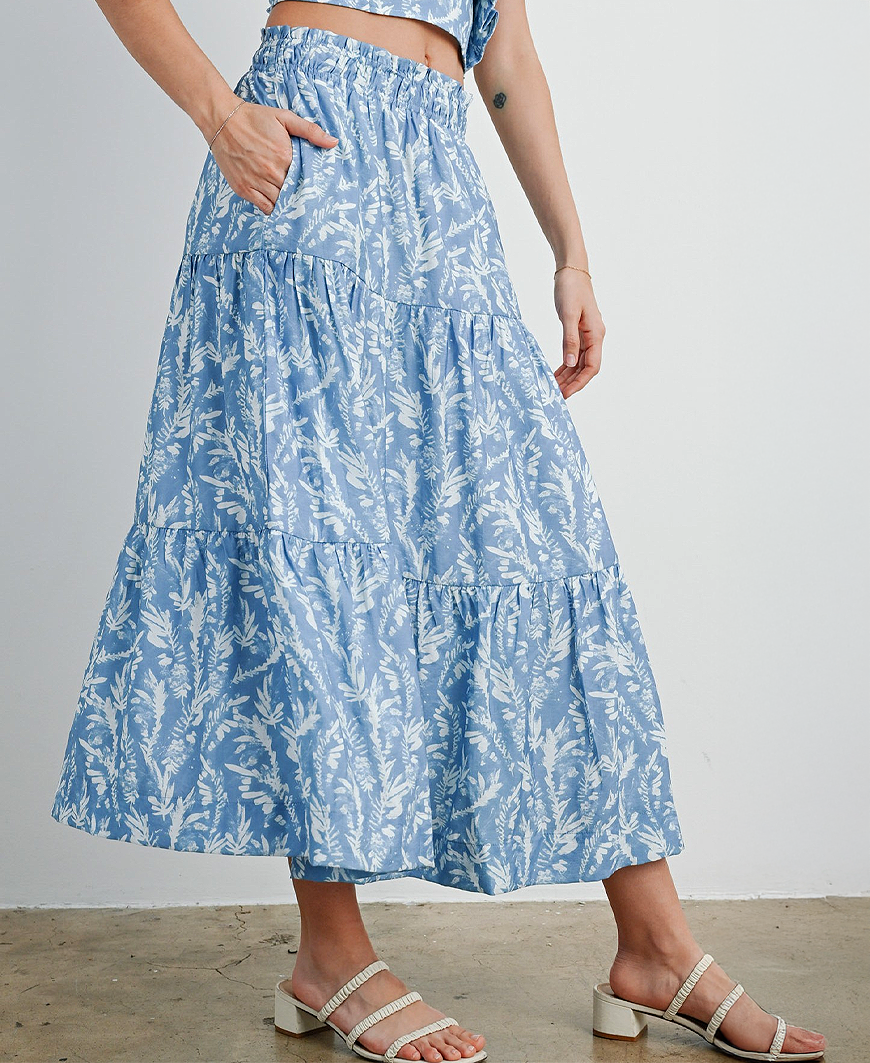 Flowy, effortless, and vacation-ready, the Tegan Leaf Maxi Skirt in Blue brings a fresh, tropical vibe to your wardrobe. Featuring a vibrant leaf print and a breezy tiered silhouette, this maxi skirt moves beautifully with every step while keeping you cool and comfortable on warm days. Designed with an easy elastic waistband, it offers a flattering, flexible fit that’s perfect for everything from beach strolls to brunch dates or summer getaways.